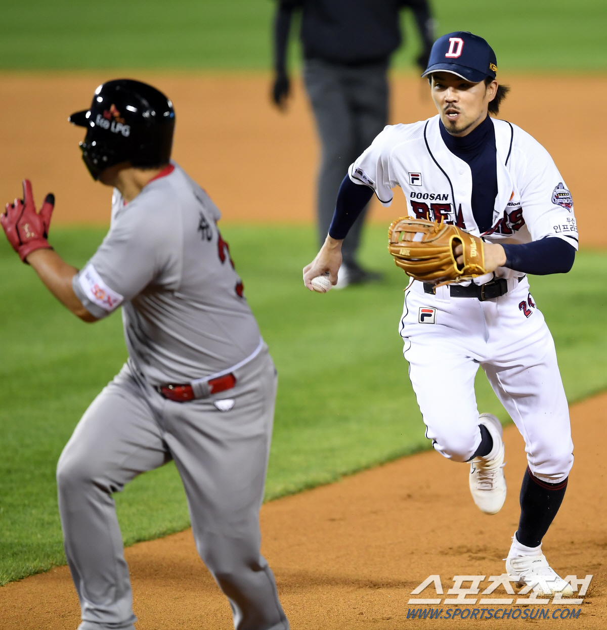 이어 인터뷰를 한 오재원은 "정의윤 선수를 태그한 후에 1루 베이스를 밟으면 더블플레이로 1점을 안주니까 그걸 노렸다. 하지만 태그를 시도할때 정의윤 선수가 스리피트를 벗어났다고 판단해서, 스리피트 아웃 이후 타자주자 포스 아웃을 하면 병살이 된다고 순간적으로 생각을 했다. 하지만 심판이 봤을 때는 스리피트 라인을 넘지 않았다고 판단했기 때문에 그 이후에 다시 태그를 하게 됐다"고 덧붙여 설명했다.