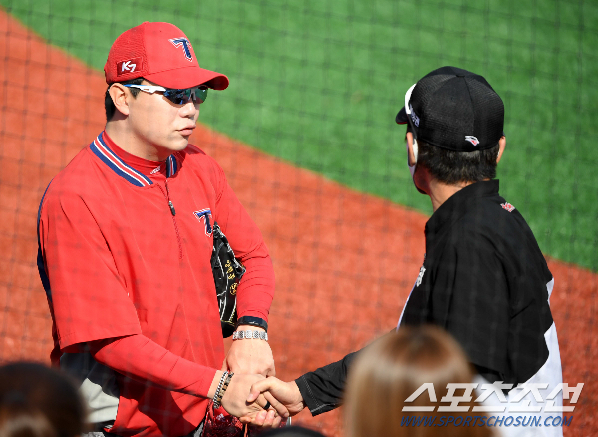 [수원=스포츠조선 김진회 기자] 27일 수원 KT 위즈파크에서 열릴 KIA 타이거즈-KT 위즈전을 앞두고 취재진과 이야기를 나누던 이강철 감독에게 KIA 에이스 양현종이 뚜벅뚜벅 걸어왔다. 이 감독은 "오지 말라니깐…"이라며 농을 던진 뒤 "와줘서 고맙다. 역시 대투수"라며 웃었다.