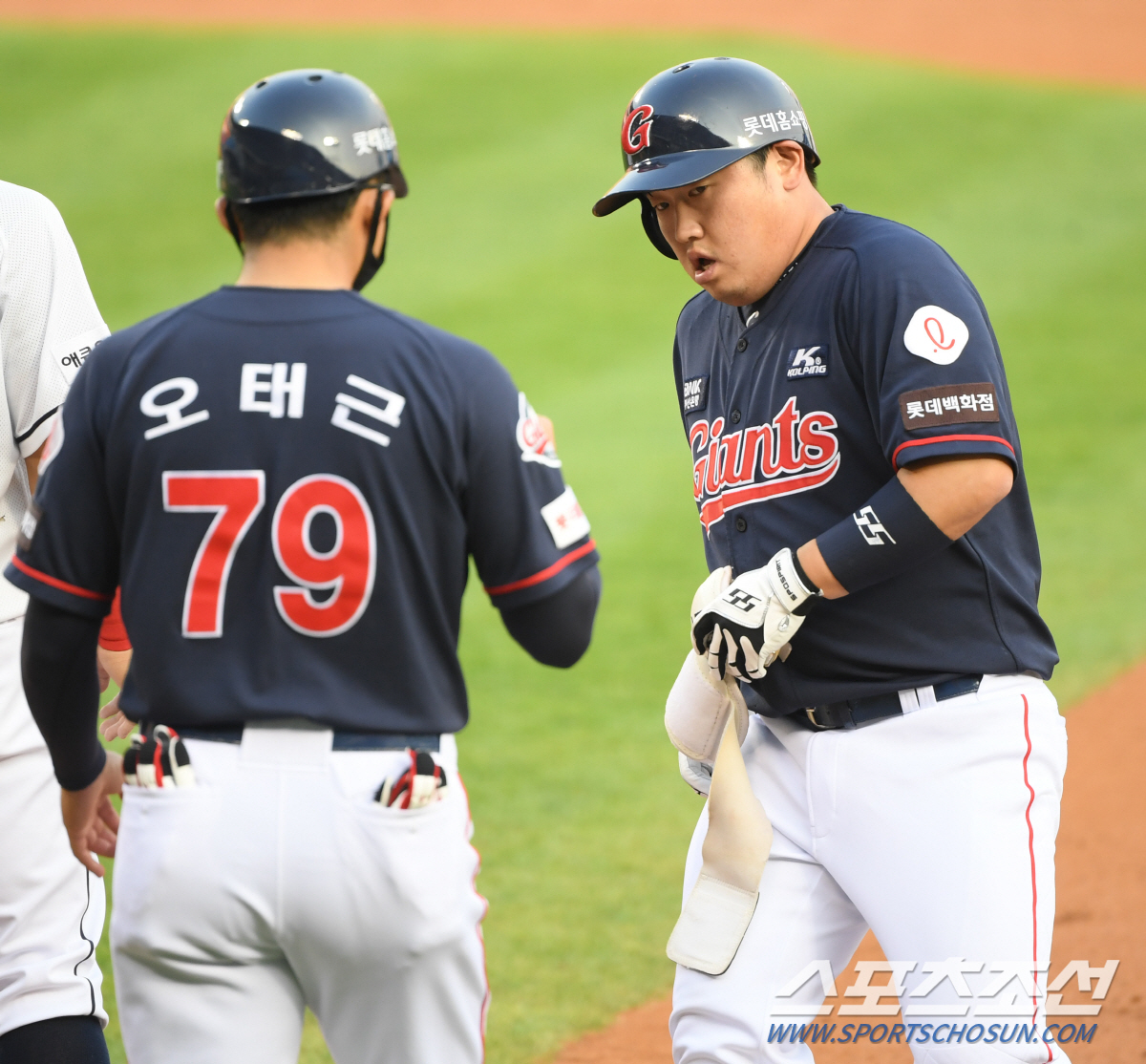 롯데 자이언츠와 두산 베어스의 2020 KBO 리그 경기가 29일 잠실구장에서 열렸다. 2회초 롯데 김준태가 중견수 앞 안타를 치고 오태근 1루 코치와 하이파이브를 하고 있다. 잠실=허상욱 기자 wook@sportschosun.com/2020.05.29/