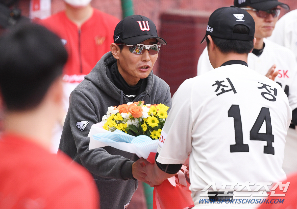 31일 인천 SK행복드림구장에서 KBO리그 SK와 한화의 경기가 열렸다. SK가 한화에 승리하며 시리즈 스윕을 달성했다. KBO리그 통산 400승을 달성한 SK 염경엽 감독이 주장 최정에게 축하 꽃다발을 건내받고 있다. 인천=송정헌 기자 songs@sportschosun.com