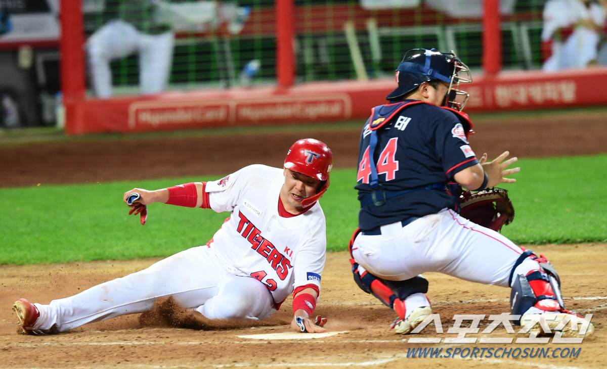 ◇KIA 한승택이 7회말 2사 2루에서 김규성의 적시타때 득점을 올리고 있다. 광주=최문영 기자 deer@sportschosun.com /2020.06.04/