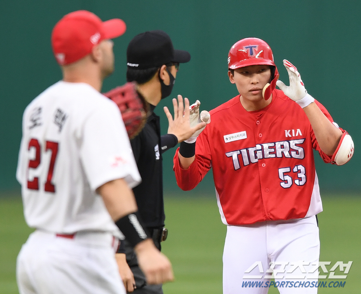 2020 KBO리그 KIA 타이거즈와 SK 와이번스의 경기가 12일 오후 인천 SK행복드림구장에서 열렸다. 1회초 무사 KIA 김호령이 2루타를 치고 나가 타임을 요청하고 있다. 인천=정재근 기자 cjg@sportschosun.com/2020.06.12/