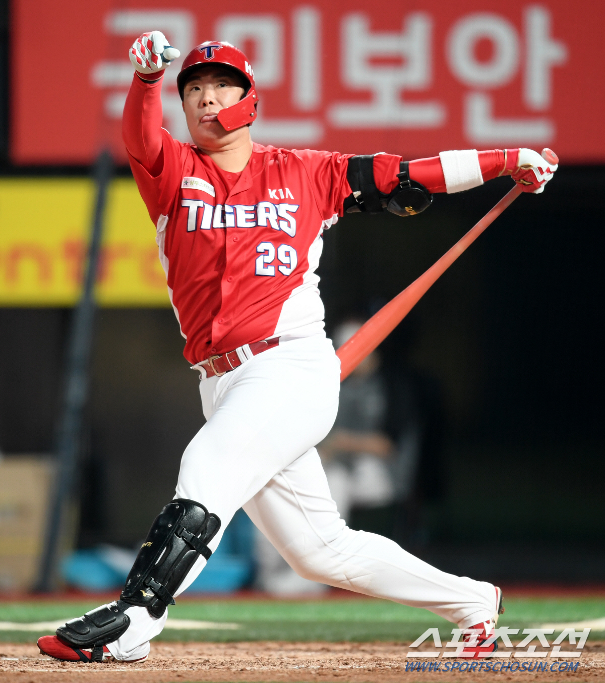 KIA는 2회 말 4점을 따내며 기선제압을 했지만, NC가 3회 초 곧바로 김태군의 투런포로 점수차를 2점으로 좁혔다. 이런 상황에서 나지완이 솔로포로 격차를 3점차로 벌리면서 선발 이민우의 어깨를 가볍게 만들었다. 광주=김진회 기자 manu35@sportschosun.com