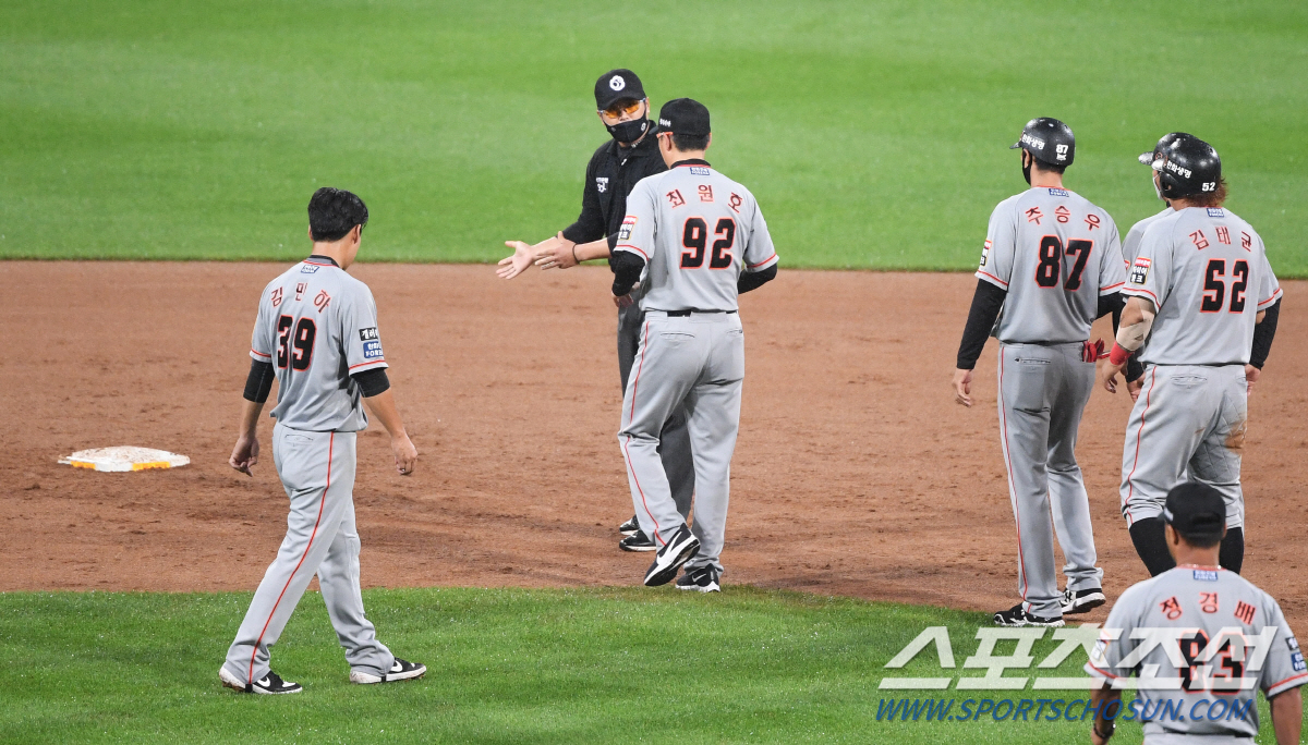 하지만 이때 1루 주자 김태균이 '수비 방해'를 선언받았다. 2루 슬라이딩 과정에서 수비를 방해했다는 판정. 때문에 한꺼번에 3아웃이 됐다. 트리플 플레이 자체도 보기 어려운데, 독특한 형태의 삼중살이 나왔다.
