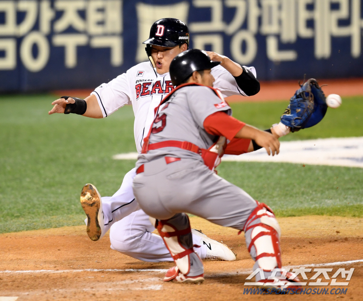 SK 와이번스와 두산 베어스의 2020 KBO 리그 경기가 15일 잠실구장에서 열렸다. 5회말 1사 1,2루 두산 최주환의 적시타때 2루주자 오재일이 홈으로 파고들어 세이프되고 있다. SK 포수는 이현석. 잠실=허상욱 기자 wook@sportschosun.com/2020.07.15/