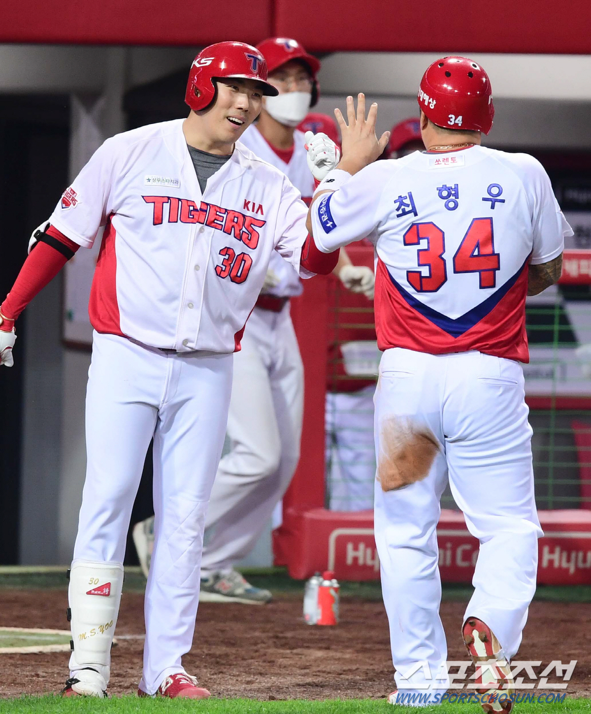 KBO리그 두산 베어스와 KIA타이거즈의 경기가 17일 광주기아챔피언스필드에서 열렸다. KIA 최형우가 5회말 1사 1루에서 나지완 우전안타때 득점을 올리고 유민상과 화이파이브 하고 있다. 광주=최문영 기자 deer@sportschosun.com /2020.07.17/