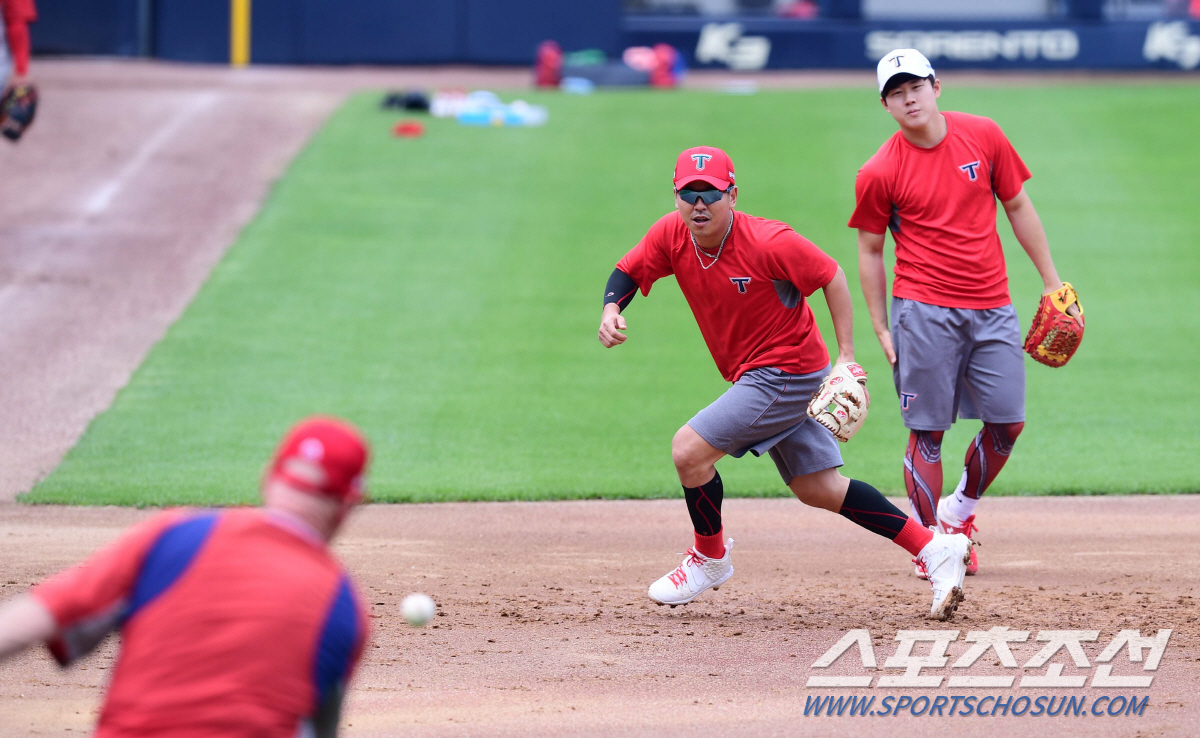 KIA의 베테랑 내야수 나주환이 18일 두산과의 홈경기를 앞두고 맷 윌리엄스 감독에게 펑고특훈을 받고 있다.