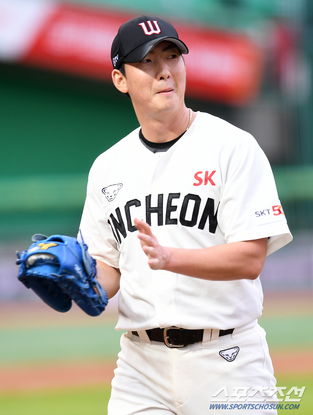 2020 KBO리그 키움 히어로즈와 SK 와이번스의 경기가 19일 인천 SK행복드림구장에서 열렸다. 4회를 무실점으로 마친 문승원이 야수들을 바라보며 박수치고 있다. 인천=정재근 기자 cjg@sportschosun.com/2020.07.19/