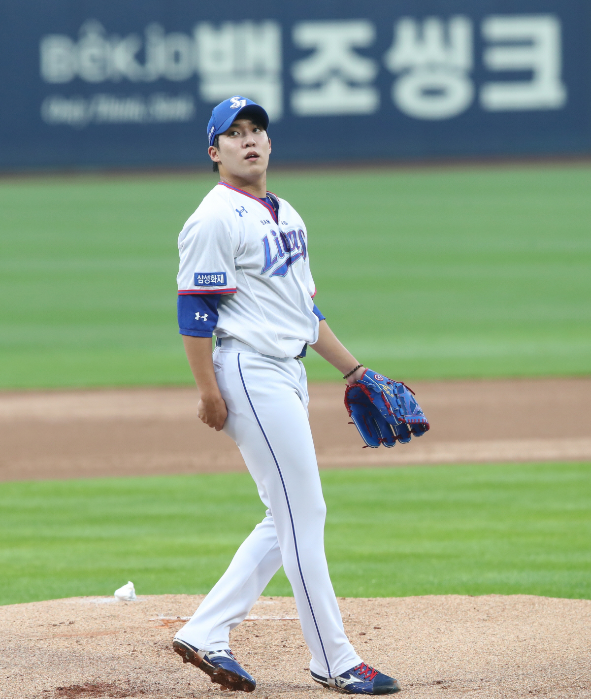 8일 키움전 이후 3주 만에 마운드에 오른 원태인. 라이온즈 파크에 첫 홈 관중이 입장한 날, 비의 훼방 속에 최악의 복귀전이 되고 말았다.