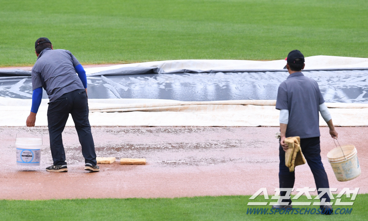 [잠실=스포츠조선 나유리 기자]비에 흥건히 젖은 그라운드. 잠실 경기가 지연 시작을 결정했다.