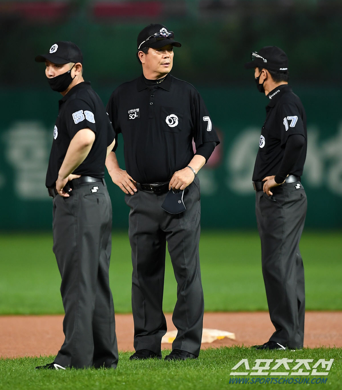 5일 인천 SK행복드림구장에서 열린 2020 KBO리그 SK 와이번스와 롯데 자이언츠의 경기가 3회초 내린 비로 인해 결국 우천 취소됐다. 문승훈 심판이 그라운드 상태를 체크하고 있다. 인천=박재만 기자 pjm@sportschosun.com/2020.08.05/