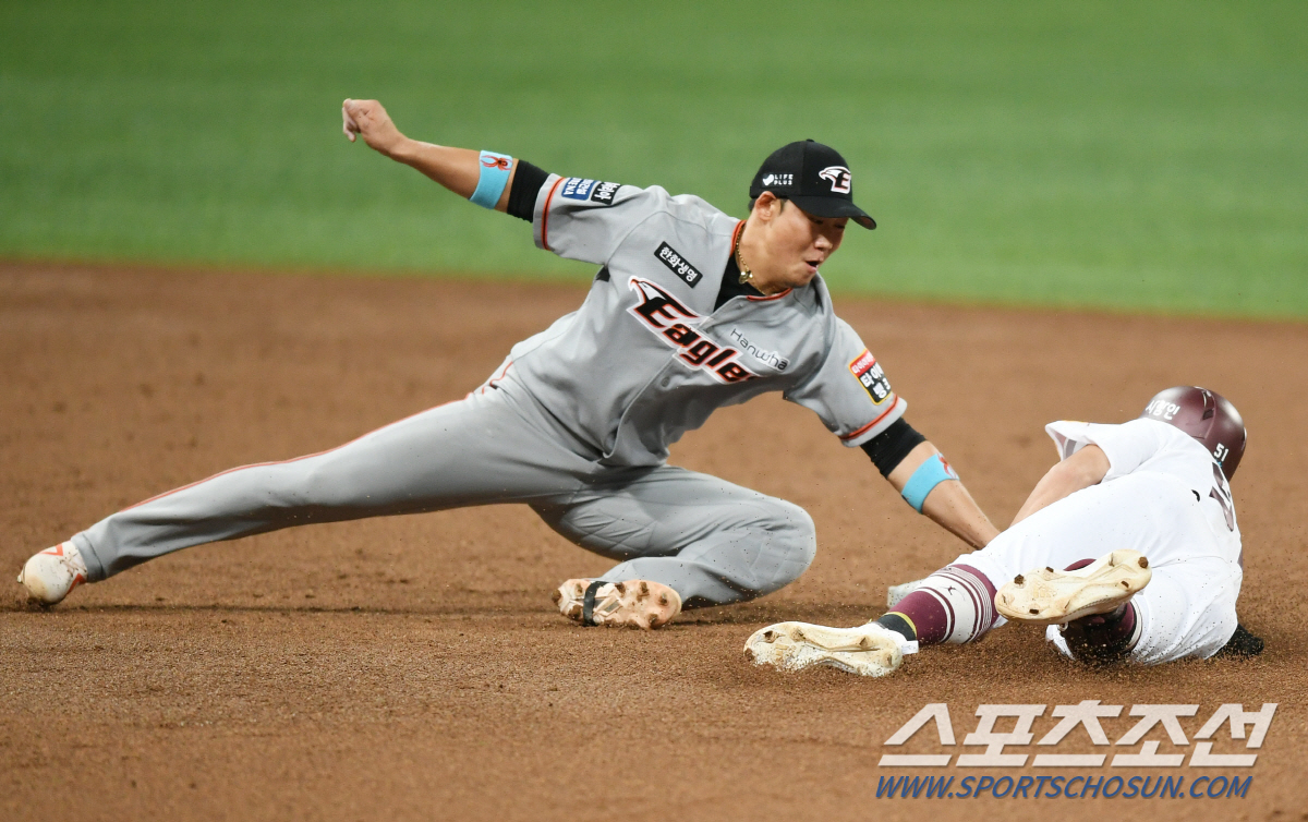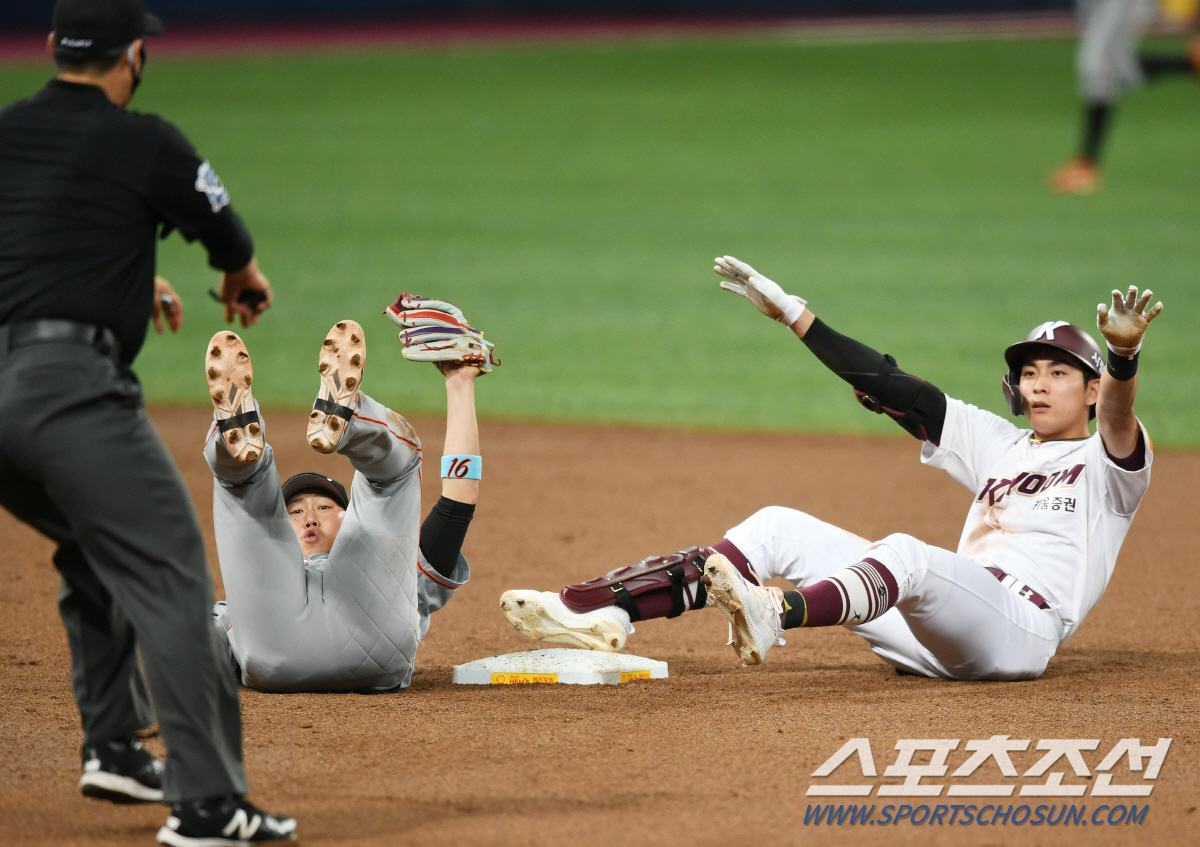 이정후가 발이 빠르긴 하지만, 2루까지 달리기엔 무리처럼 보였다. 예상대로 공이 빨랐다. 한화 유격수 하주석이 공을 잡고 2루에서 기다리고 있었다. 하지만 이정후의 발걸음에는 주저함이 없었다.