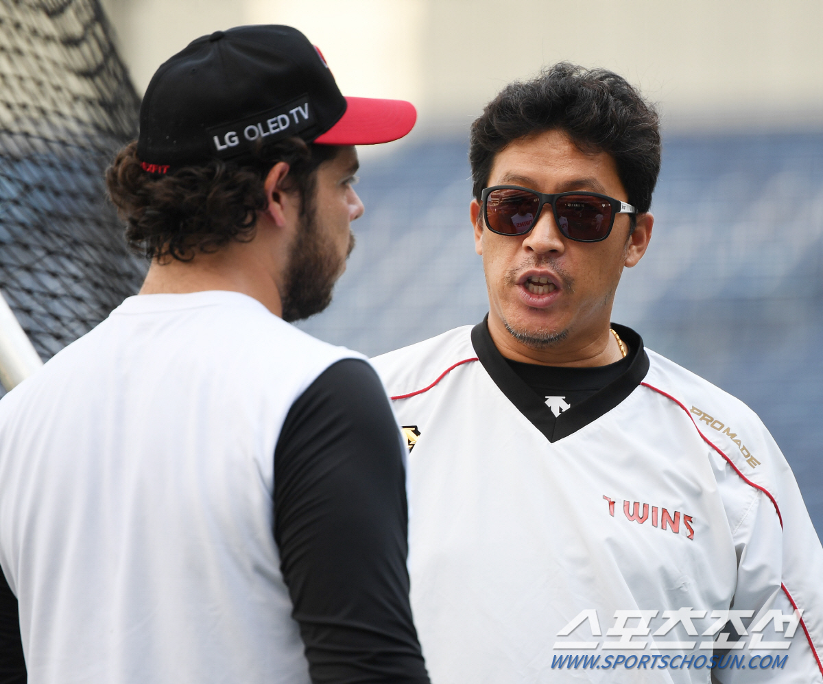 | 2020 KBO리그 LG 트윈스와 NC 다이노스의 경기가 14일 창원 NC파크에서 열린다. LG 이병규 코치가 라모스에게 조언을 하고 있다. 창원=정재근 기자 |