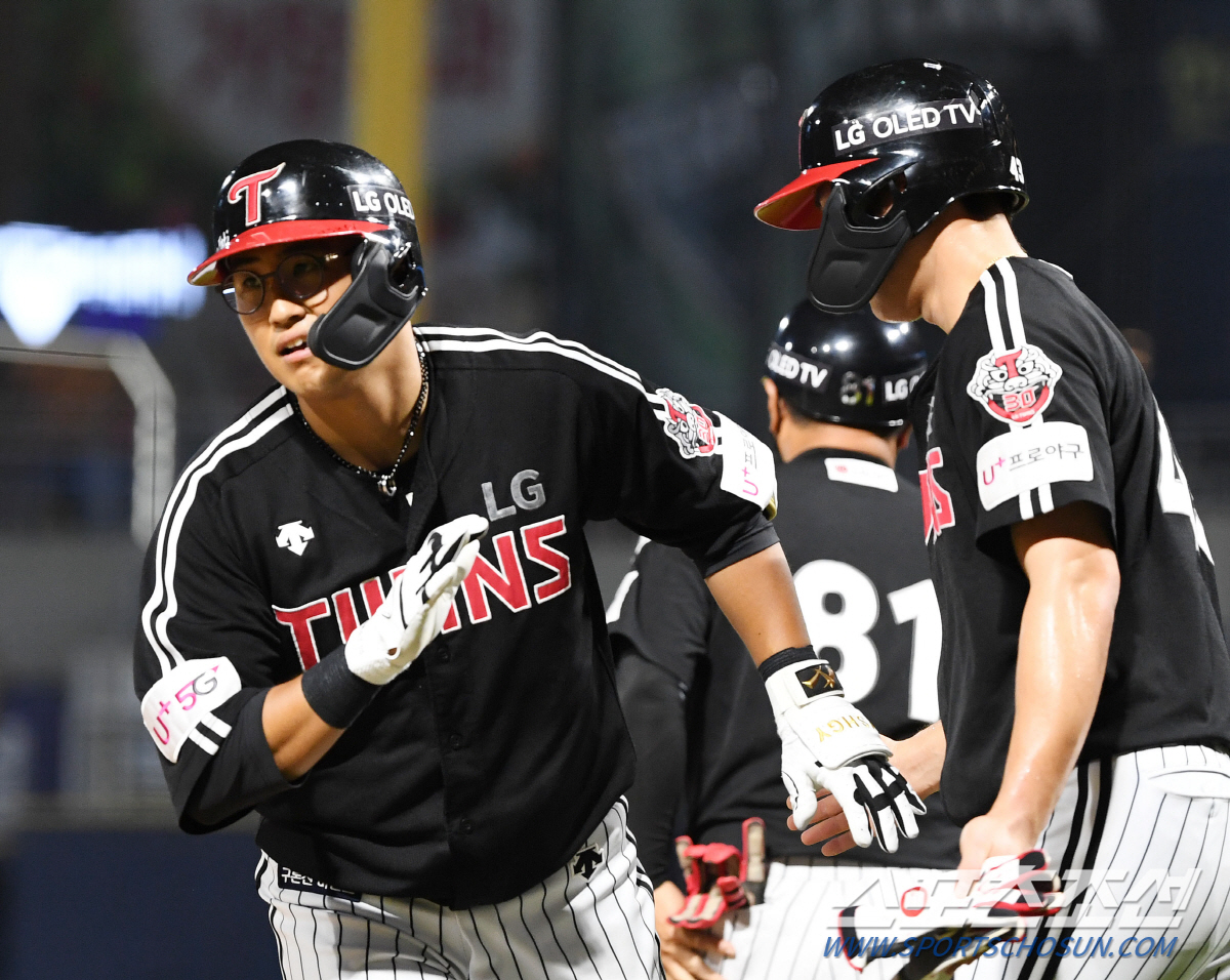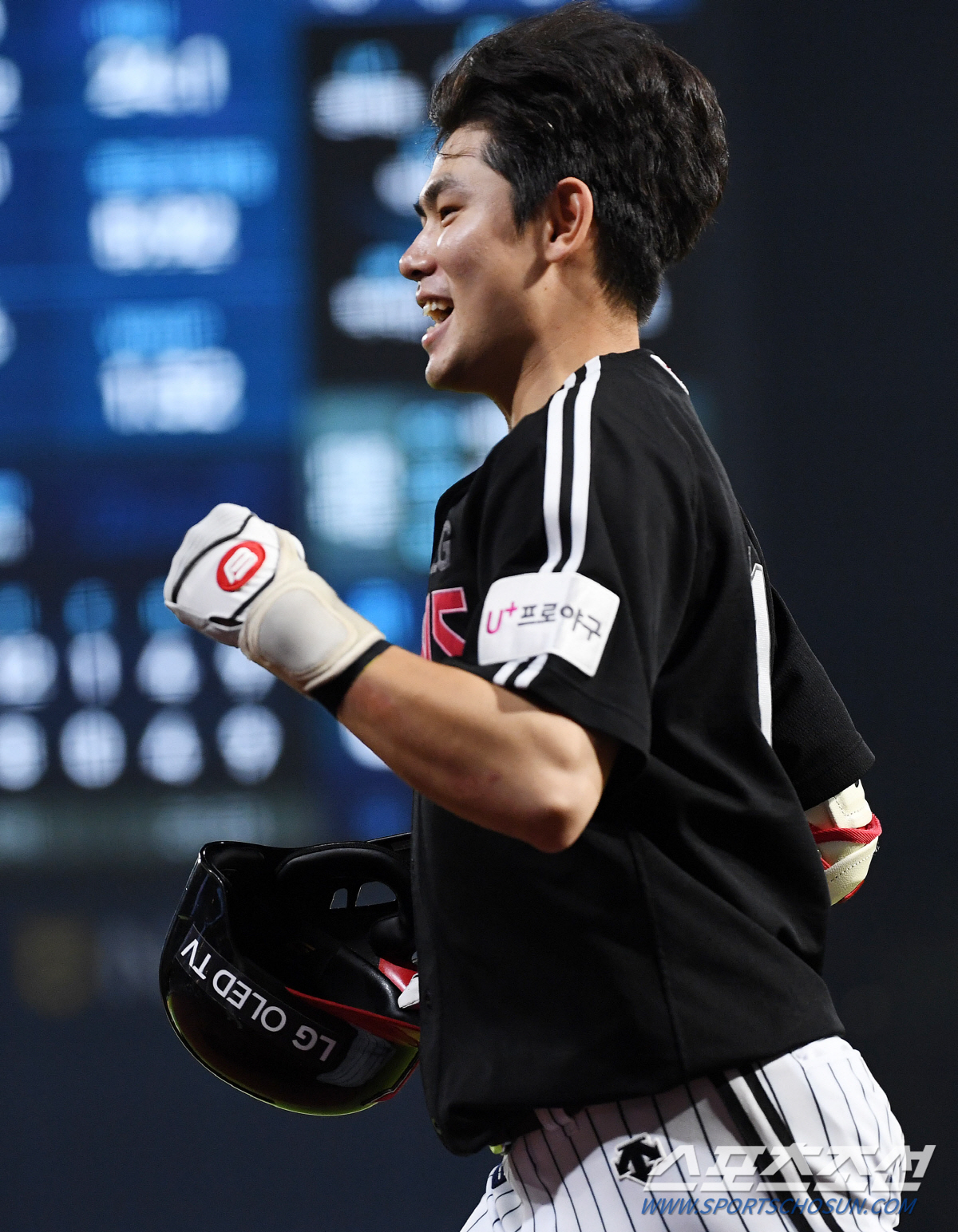 결승 투런포를 치고 들어오는 홍창기가 환호하고 있다.