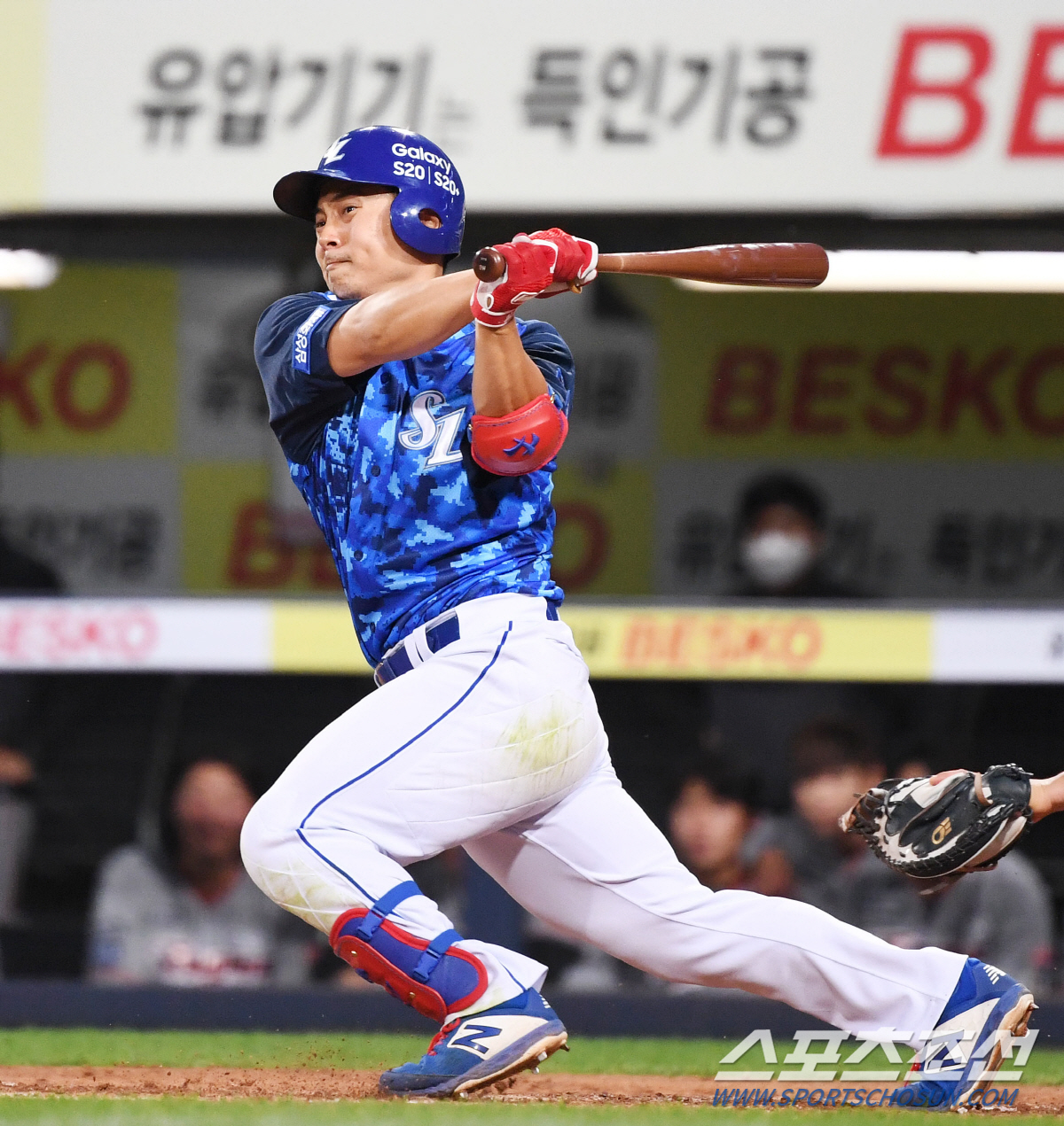 볼카운트 2B2S에서 한화 선발 서폴드의 5구째 시속 139㎞의 가운데 높은 컷 패스트볼을 힘껏 당겨 좌중간 담장을 넘겼다.