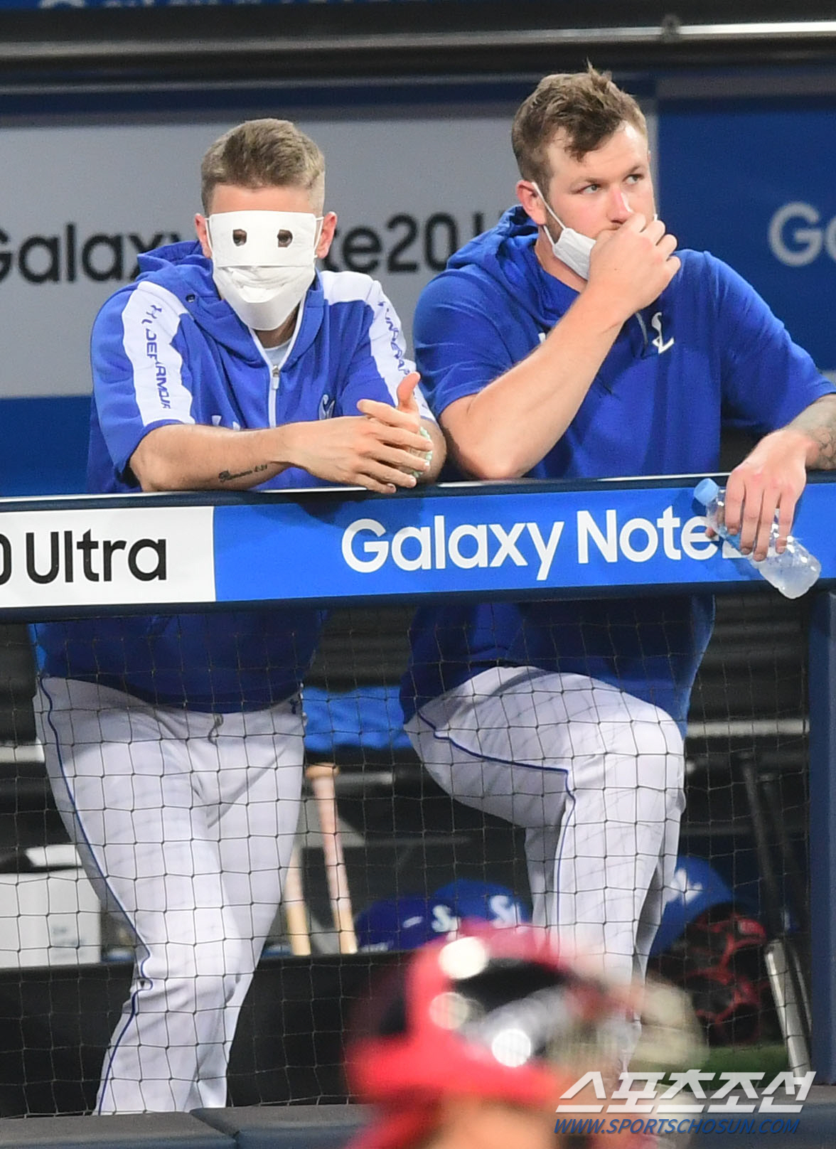 KBO리그 삼성라이온스와 LG트윈스의 경기가 25일 대구삼성라이온스파크에서 열렸다. 삼성 뷰캐넌이 얼굴을 가린 가면 마스크를 쓰고 동료들의 플레이를 보고 있다. 대구=최문영 기자 deer@sportschosun.com