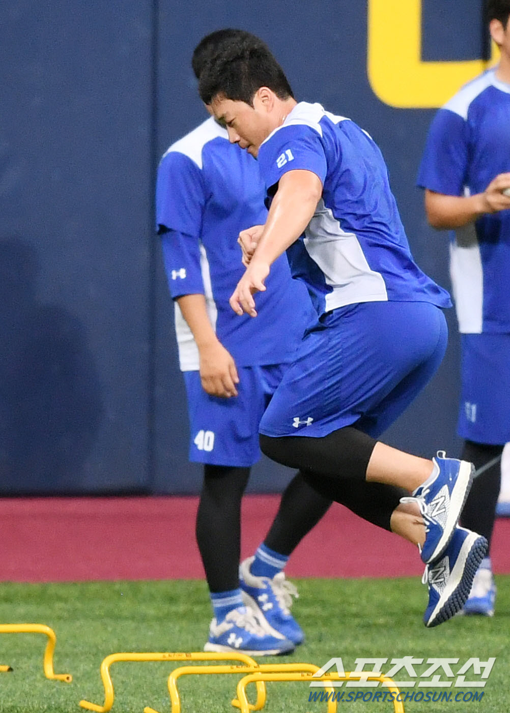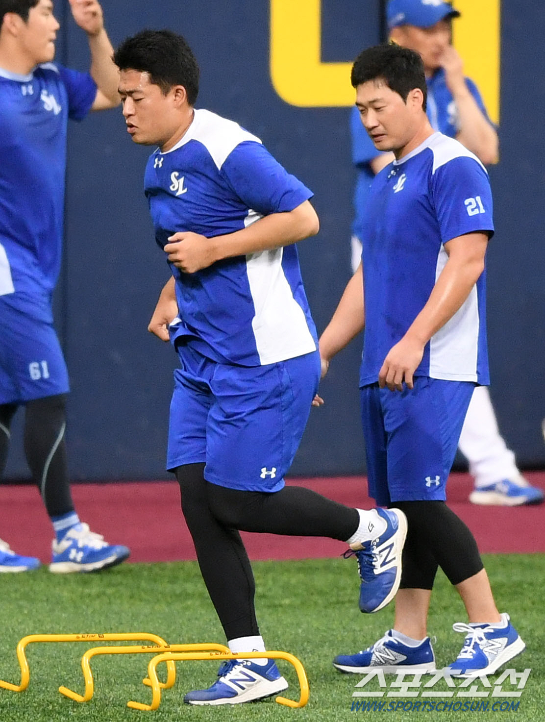 지난 27일 전역 후 다음 날인 28일 1군에 합류한 심창민은 이날 오승환과 함께 외야에서 캐치볼과 러닝을 소화했다.