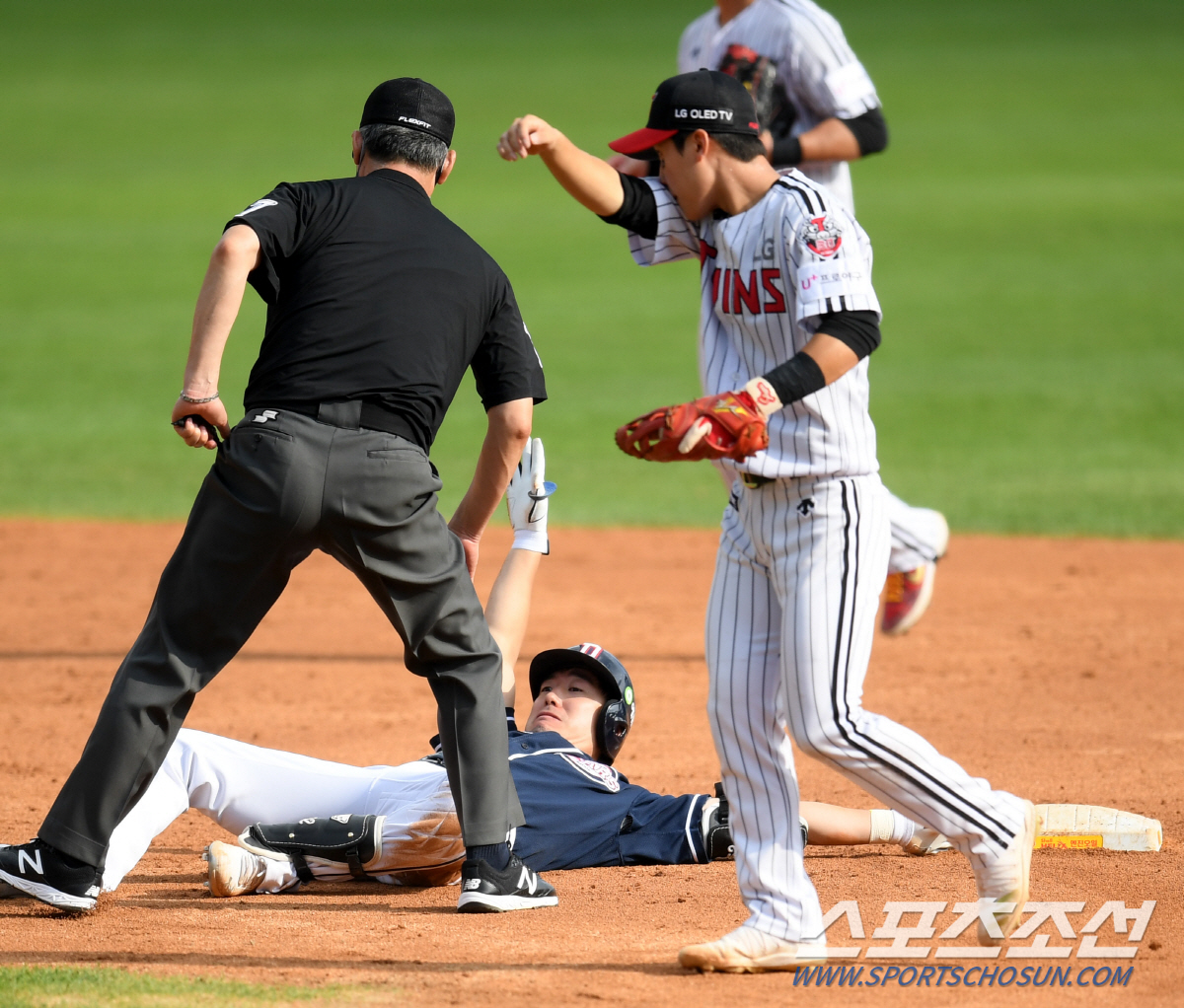 '비디오 판독 해줄게요~' 2루심이 판독을 위해 자리를 떠날 때 까지도 베이스에 손은 계속!