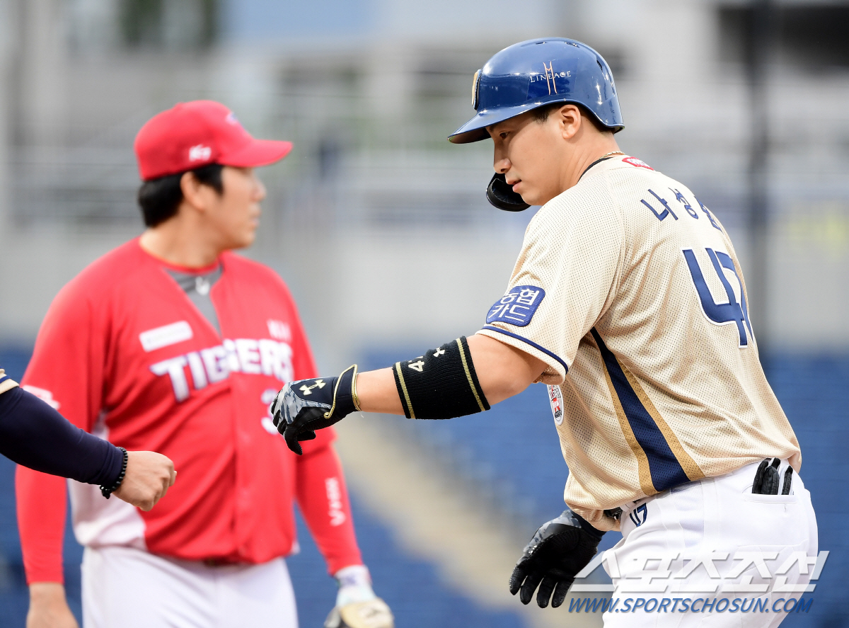 나성범은 1회말 1사 2루에서 첫 타석을 맞이했다. 나성범은 애런 브룩스에게 좌전 적시타를 쳐 선취점을 뽑았다. 이어 양의지의 우전 안타로 3루까지 진루했다. 그러나 이원재가 헛스윙 삼진으로 물러났다. 3회말 무사 1,2루 기회에선 김성욱이 대신 타석에 들어섰다.