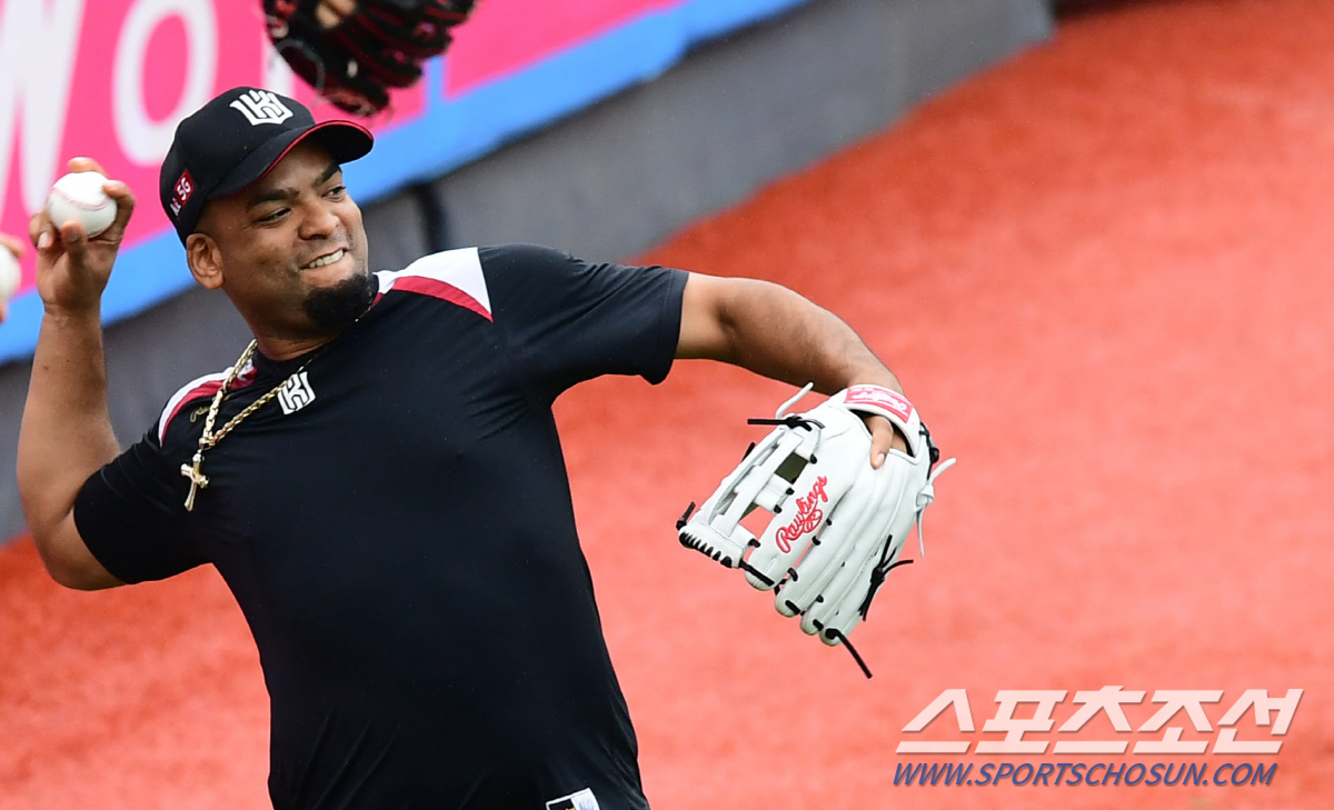 KT 데스파이네가 16일 수원 kt위즈파크에서 열리는 삼성라이온즈와의 홈 경기를 앞두고 1루 수비 훈련에 열중하고 있다. KT에이스 데스파이네는 15일 수원 삼성전에 선발 등판해 6.1이닝 9안타(1홈런) 4볼넷 1탈삼진 7실점(6자책점)으로 패전 투수가 되었다. 6.1이닝을 소화하며 불펜을 아끼게 해준 데스파이네는 6이닝을 소화한 상대 선발 뷰캐넌보다 더 많이 던지며 '이닝 이터'로서 임무를 완수했다. 수원=최문영 기자 deer@sportschosun.com