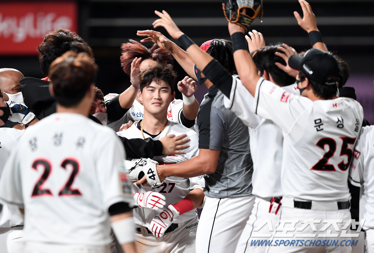 하지만 배정대가 경기를 끝냈다. 연장 11회말 1아웃 주자 없는 상황에서 타석에 선 배정대는 박치국의 초구 슬라이더를 강하게 받아쳤다. 맞자마자 홈런임을 직감할 수 있는 타구. 그대로 왼쪽 담장을 넘어가 경기를 끝내는 홈런이 됐다. KT의 공동 3위 등극을 자축하는 축포였다.