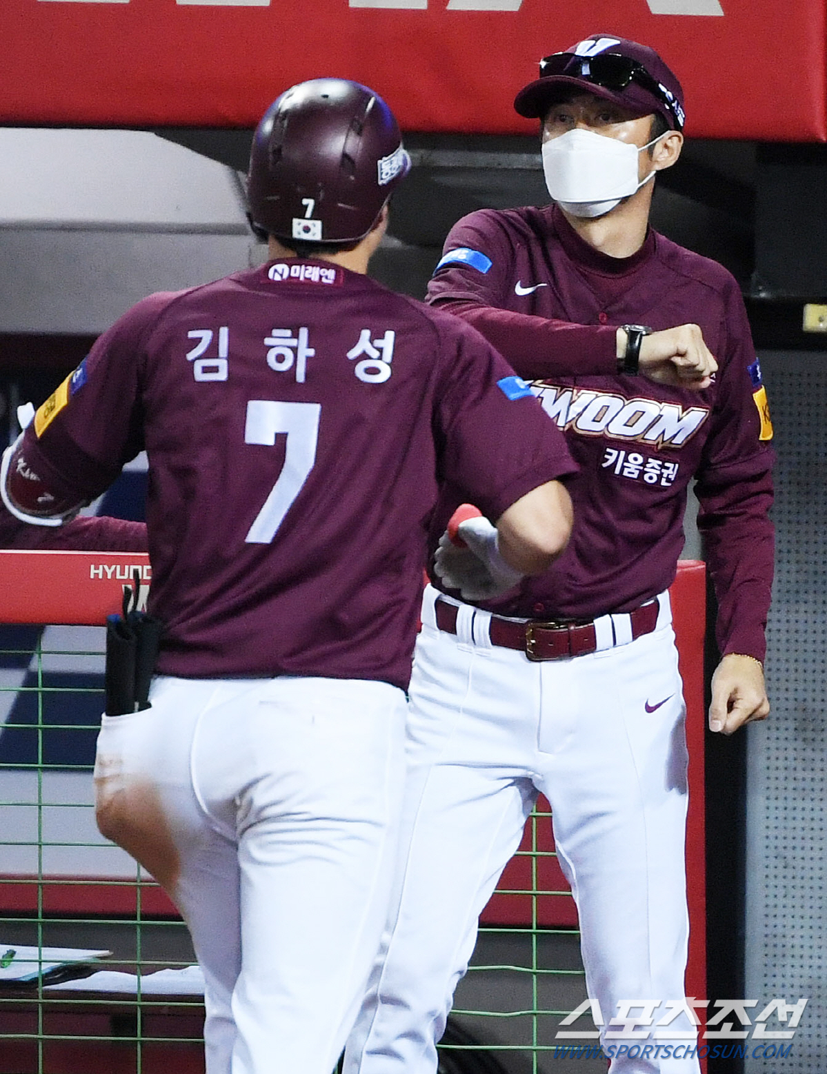 2020 KBO리그 키움 히어로즈와 KIA 타이거즈의 경기가 23일 광주 KIA챔피언스필드에서 열렸다. 8회초 2사 2루 김하성이 투런포를 치고 들어오며 손혁 감독의 축하를 받고 있다. 광주=정재근 기자 cjg@sportschosun.com/2020.09.23/