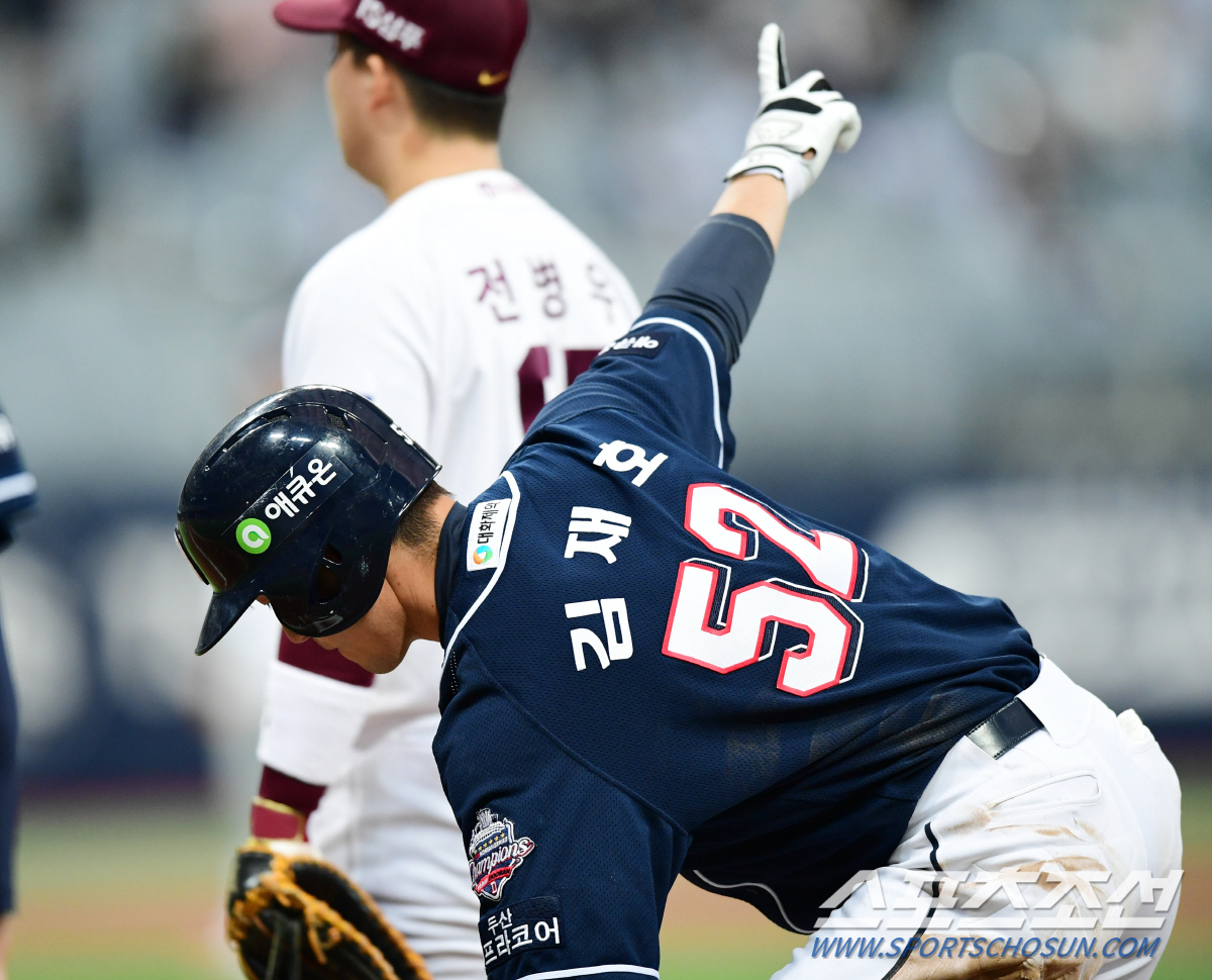 2020 KBO리그 두산 베어스와 키움 히어로즈의 경기가 18일 고척스카이돔에서 열렸다. 7회초 무사 2루 김재호가 1타점 안타를 치고 나가 팀 세리머니를 하고 있다. 고척=정재근 기자 cjg@sportschosun.com/2020.10.18/