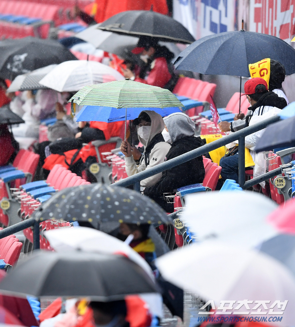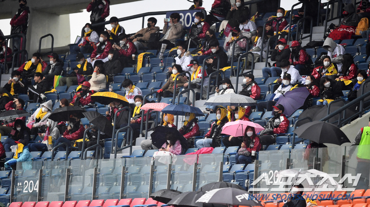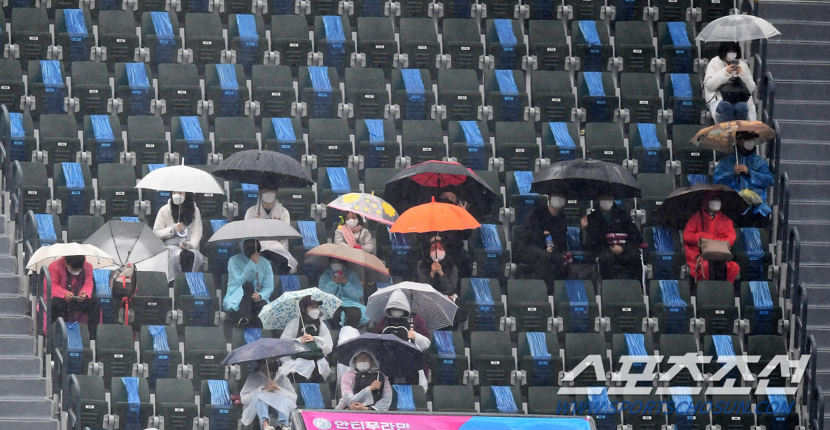 WC 1차전이 우천으로 인해 순연됐다. 우천으로 인해 경기가 1시간 넘게 지연되자 우산을 쓰고 경기를 기다리고 있는 야구팬들.