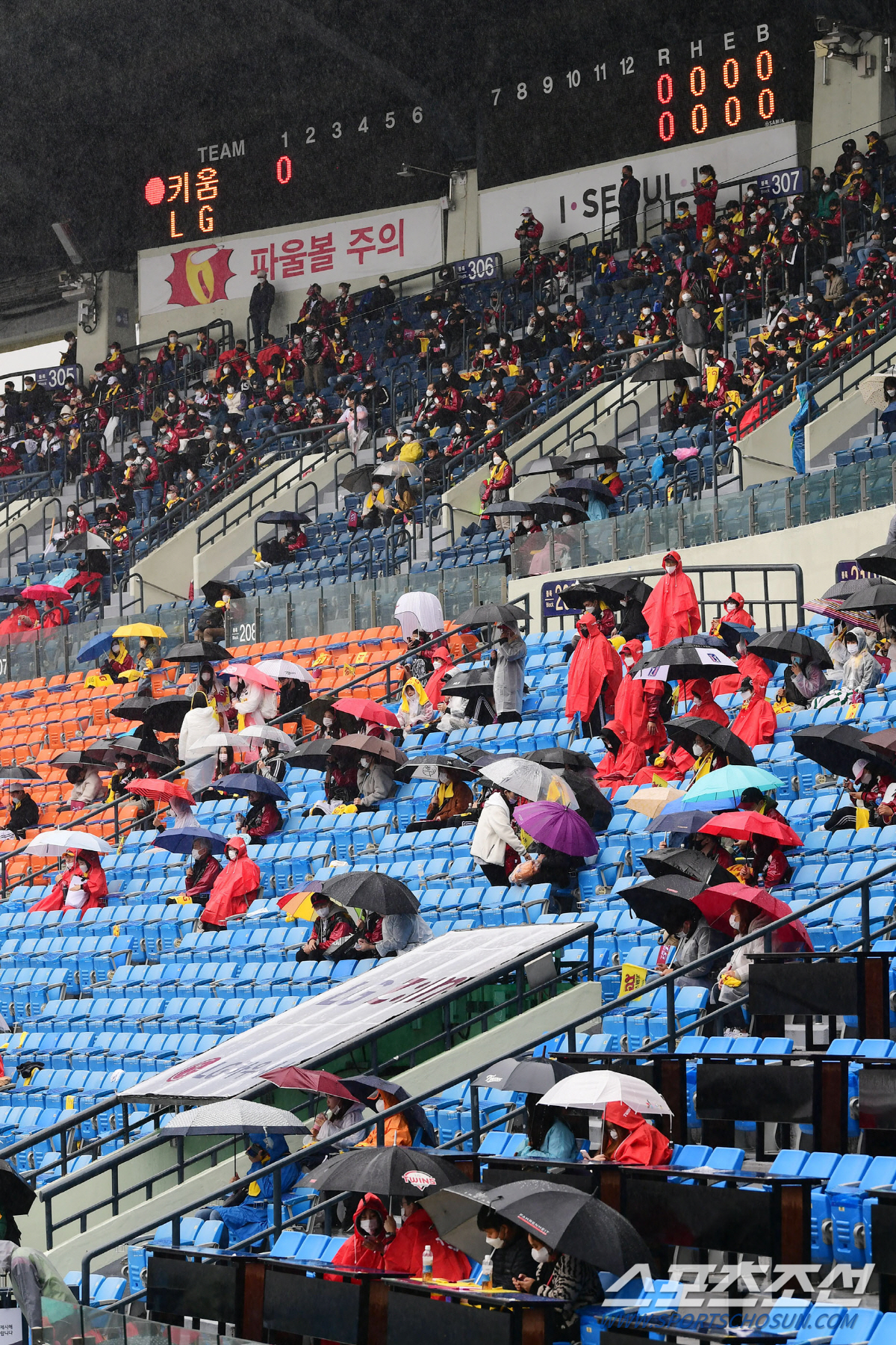 관중석에서 경기 시작을 1시간 넘게 기다린 야구팬들은 우천 취소가 확정되자 곳곳에서 탄식 어린 소리가 나왔다. 비가 내리는 날씨 속에도 끝까지 가을야구를 기다린 야구팬들의 아쉬움은 클 수밖에 없었다. 잠실=송정헌 기자 songs@sportschosun.com