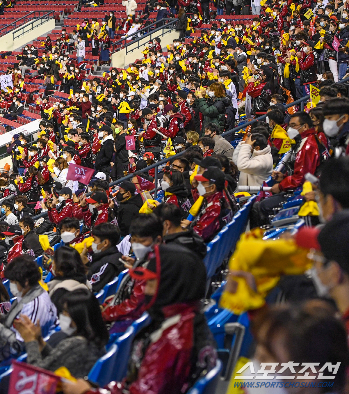 2020 KBO리그 포스트시즌 와일드카드 결정전 1차전 LG 트윈스와 키움 히어로즈의 경기가 2일 잠실구장에서 열렸다. 경기장을 찾은 관중들이 열띤 응원전을 펼치고 있다. 잠실=박재만 기자 pjm@sportschosun.com/2020.11.02/