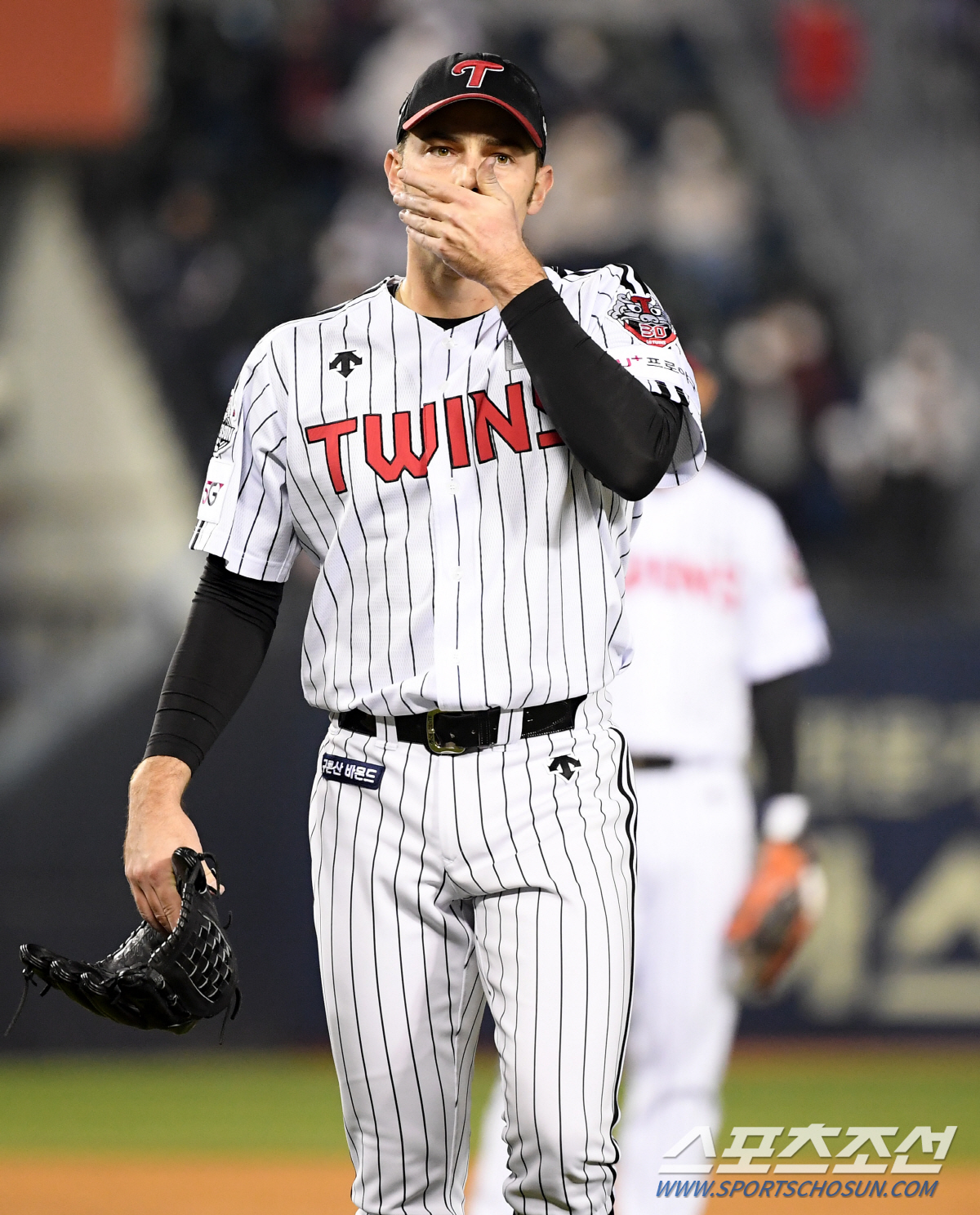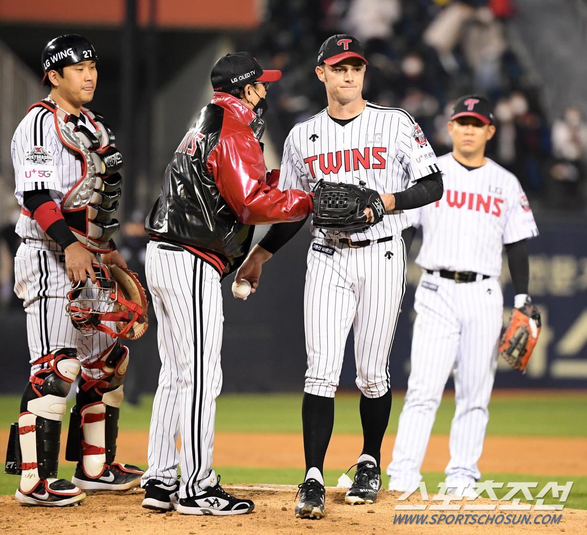 LG 최일언 투수코치가 마운드를 방문했다. 근심 어린 노 코치를 윌슨은 미소로 돌려보냈다.