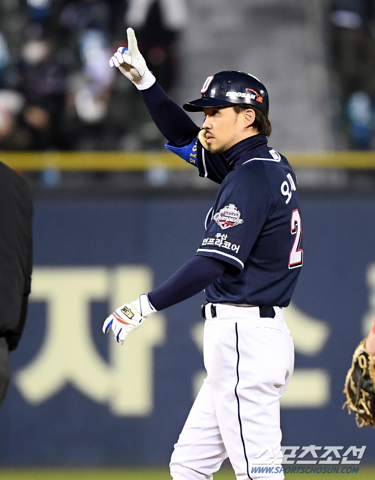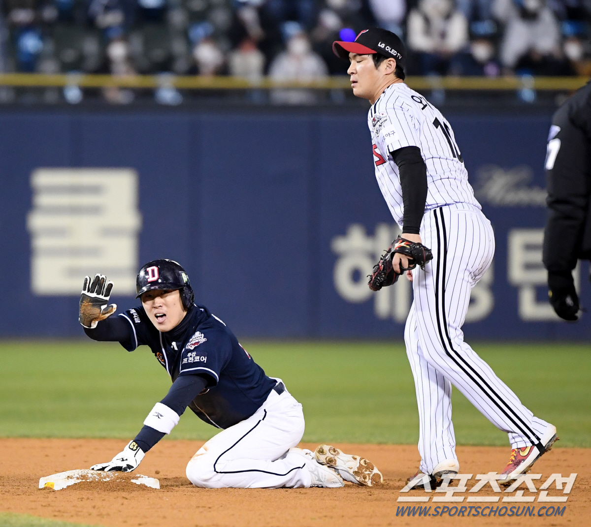 하지만 1루주자 허경민은 박세혁 타석 때 초구에 2루도루를 감행했다. 변화구 타이밍(124㎞ 체인지업)을 기막히게 포착해 넉넉히 세이프. 곧바로 박세혁이 윌슨의 커브를 중전 적시타로 연결했다.