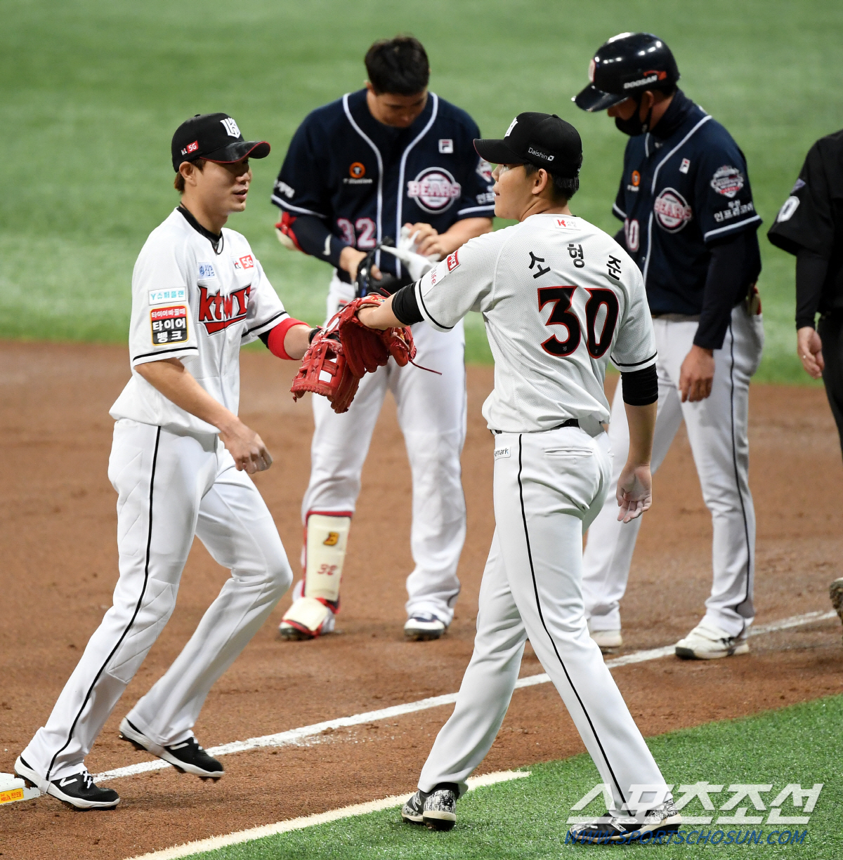 선두 박세혁이 친 투수 강습 타구는 중견수 쪽으로 빠져나가는 완벽한 안타성 타구였다. 하지만 풋워크가 좋은 심우준이 어느덧 2루 베이스 쪽에 도달했다. 빠르게 타구를 낚아챈 그는 1루에 던져 박세혁을 잡아냈다. 발 빠른 박세혁이 무사에 출루했다면 소형준에게 두번째 고비가 올 뻔 했던 순간.