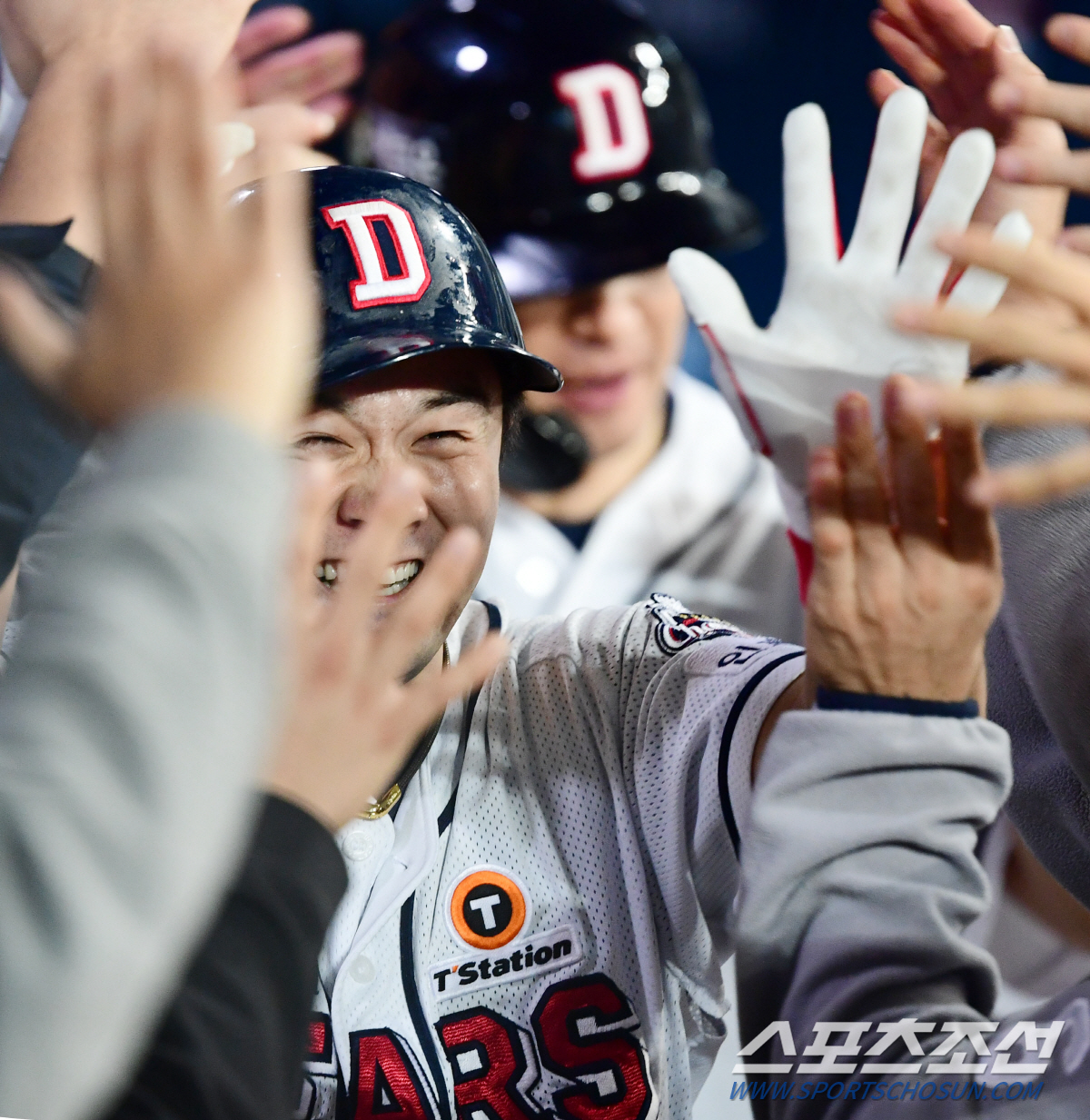 2020 KBO리그 두산과 KT의 PO 3차전이 고척스카이돔에서 열렸다. 8회말 1사 오재원이 솔로포를 치고 들어오며 환호하고 있다. 고척=정재근 기자 cjg@sportschosun.com/2020.11.12/