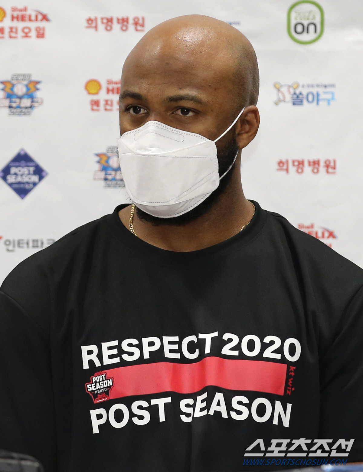 | KT 로하스가 13일 서울 고척스카이돔에서 열리는 KBO리그 플레이오프 4차전을 앞두고 취재진의 질문에 답하고 있다. 고척=최문영 기자 deer@sportschosun.com /2020.11.13/ |