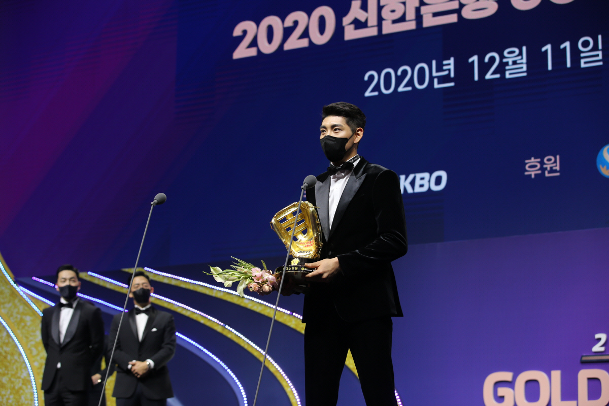 이정후는 11일 서울 코엑스 오디토리움에서 열린 2020 신한은행 SOL KBO 골든글러브 시상식에서 외야수 부문 골든글러브 수상자로 호명됐다.