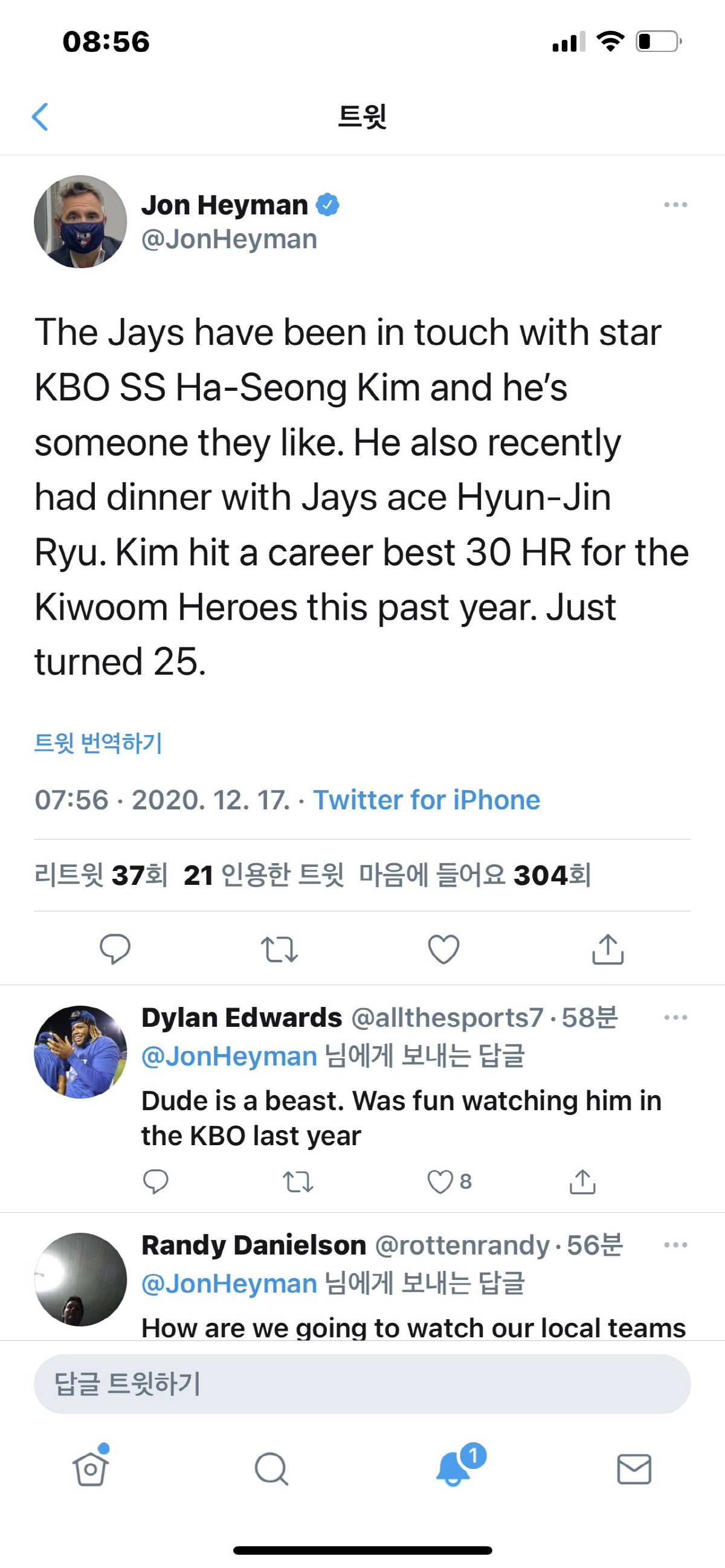 토론토는 현재 3루가 비어있다. 올해 주전이었던 트래비스 쇼와 이별했다. 블라디미르 게레로 주니어는 18kg 감량을 과시하는 등 3루수 복귀 의욕을 불태우고 있는 상황. 그러나 토론토가 이를 받아들일 가능성은 높지 않다. 현지 매체들은 '3루는 다른 선수로 채우고, 캐번 비지오를 외야로 보내야 한다. 김하성 영입으로 2루를 채워야 한다'는 목소리를 내고 있다.