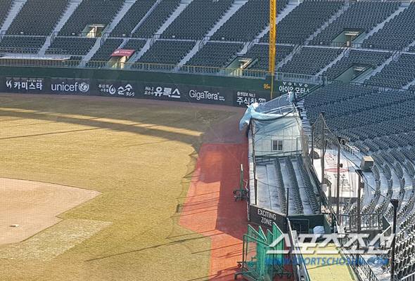 결국 문제가 생겼다. '퍽'하는 소리와 함께 사정없이 몰아친 칼날 같은 겨울바람이 1루쪽 불펜 비닐하우스를 큼직하게 찢어놓았다. 다행히 위쪽 비닐이 찢어졌을 뿐, 비닐에 덮여있던 몸체에는 문제가 없었다.