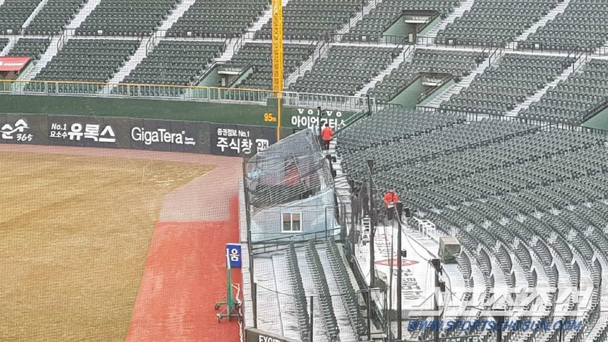 [부산=스포츠조선 김영록 기자]2021년 롯데 자이언츠 우승을 예고하는 '액땜'일까. 사직구장에 몰아친 바닷바람이 비닐하우스를 사정없이 헤집었다.