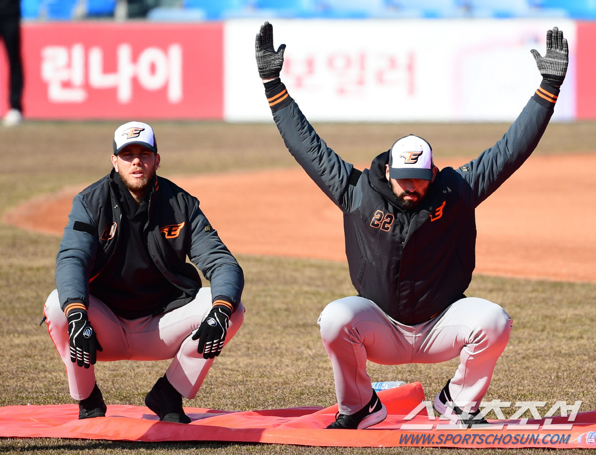 프로야구 한화 이글스의 외국인 투수 킹험과 카펜터가 19일 한화생명 이글스파크에서 첫 불펜 피칭을 했다. 두 선수는 피칭에 앞서 스트레칭, 메디신 볼 던지가, 트램폴린의 바운스 이용해 공 잡기 등 여러 단계의 준비운동을 꼼꼼히 소화 한 후에 마운드에 올랐다.