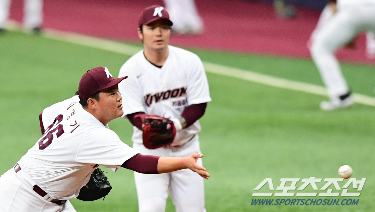 키움 1루의 미래 이명기가 22일 고척 스카이돔에서 진행된 스프링캠프 훈련에서 '대선배' 박병호와 수비 훈련을 하고 있다.