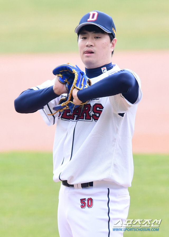 '학폭 논란'에 휩싸인 두산 투수 이영하가 21일 잠실야구장에서 열린 kt위즈와의 시범경기를 앞두고 몸을 풀고 있다.