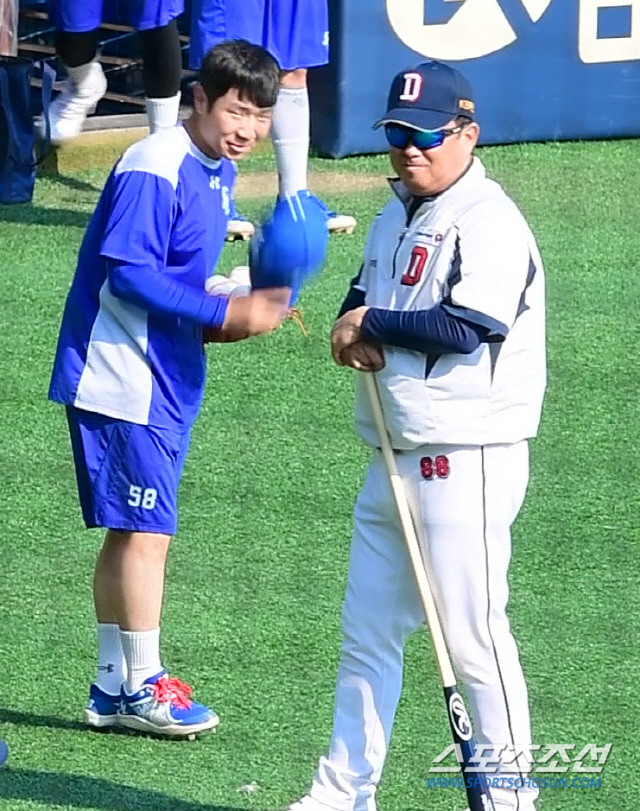 경기장에 도착한 삼성 선수단이 하나 둘씩 그라운드로 나섰고 박승규와 함께 잠시 대기하며 두산의 훈련을 지켜보던 김지찬이 적장 김태형 감독의 부름을 받았다.