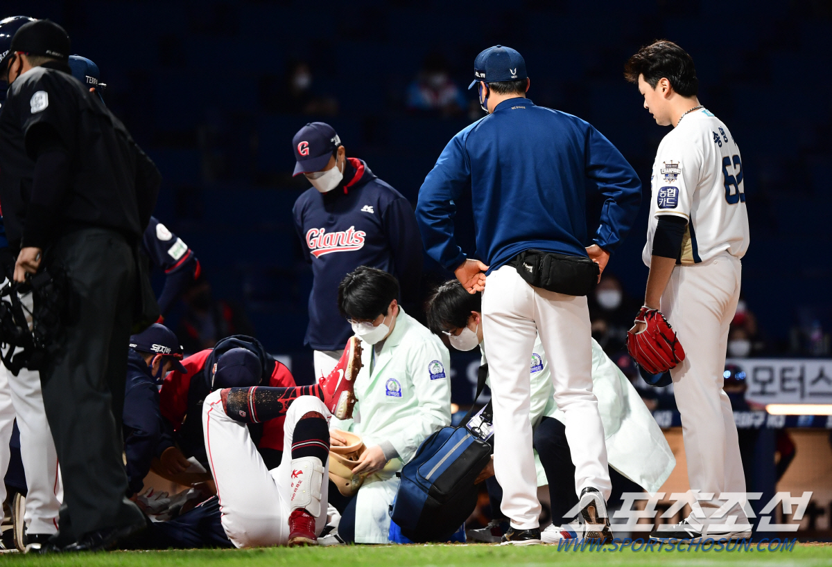 미처 피할 새가 없었다. 공이 송명기의 손에서 빠지면서 마차도의 머리로 날아들었고, 이마 쪽을 강타했다. 헬멧이 있다고는 하지만, 충격을 막아주긴 역부족. 마차도는 그 자리에서 머리를 감싸쥐며 나뒹굴었고, 허문회 감독과 이동욱 감독을 비롯한 양팀 코칭스태프도 그라운드로 뛰쳐나왔다. 21세 영건 송명기도 깜짝 놀라 망연자실, 입술을 깨물며 미안한 속내를 감추지 못했다.