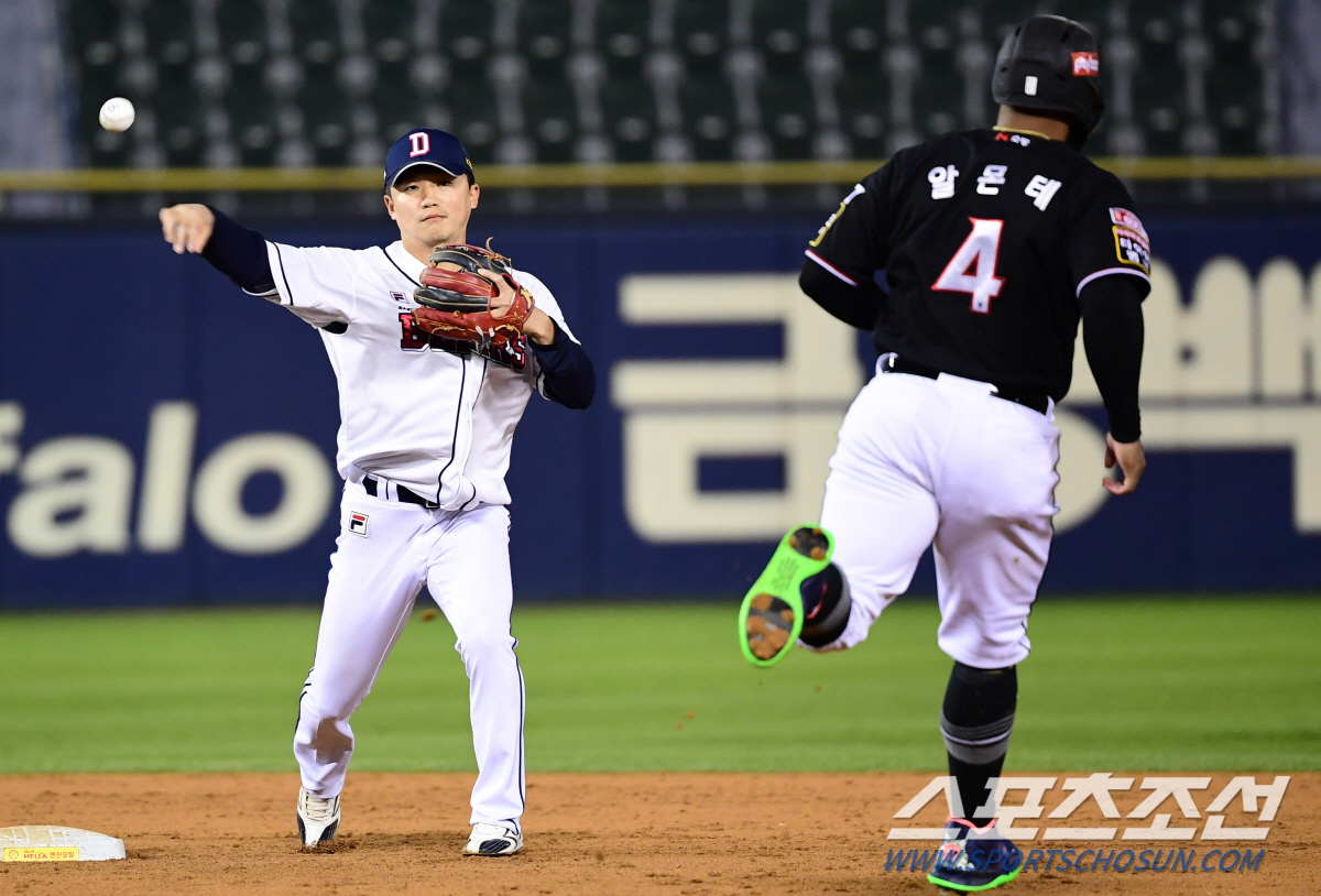 2021 KBO리그 kt위즈와 두산베어스의 경기가 14일 서울 잠실야구장에서 열렸다. KT 알몬테가 4회말 1사 1,3루에서 박경수 병살타때 2루에서 포스아웃 되고 있다. 잠실=최문영 기자 deer@sportschosun.com /2021.04.14/