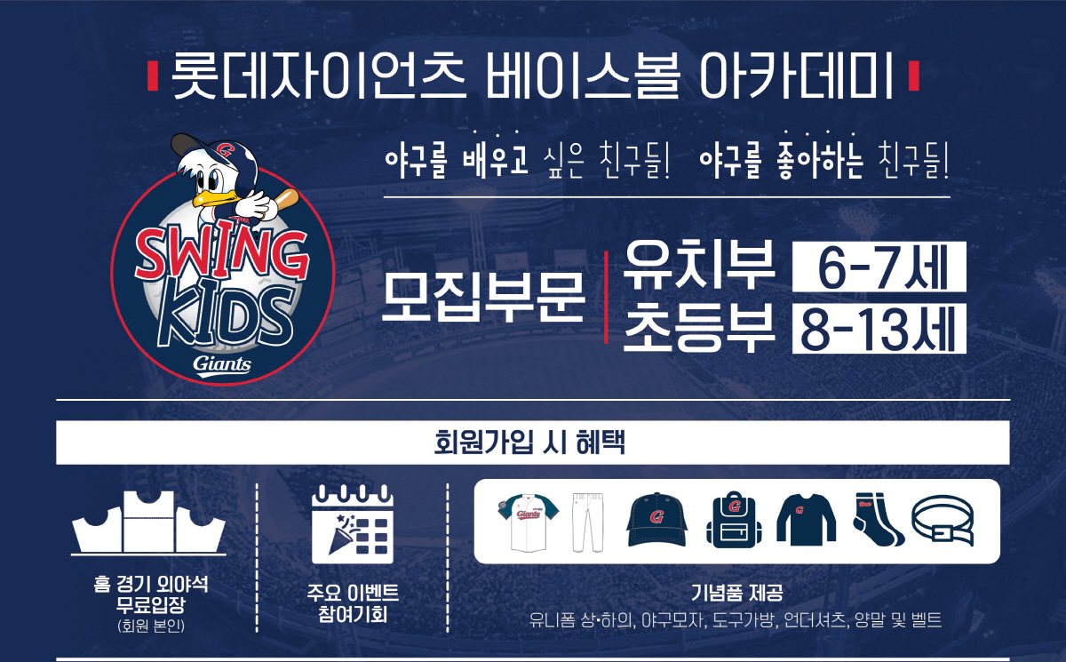 회원가입은 4월 16일부터 구단 홈페이지와 공식 SNS(페이스북, 인스타그램)을 통해 할 수 있다. 자세한 문의는 전화 또는 카카오톡 오픈채팅방 '롯데자이언츠 스윙키즈'를 통해 가능하다.