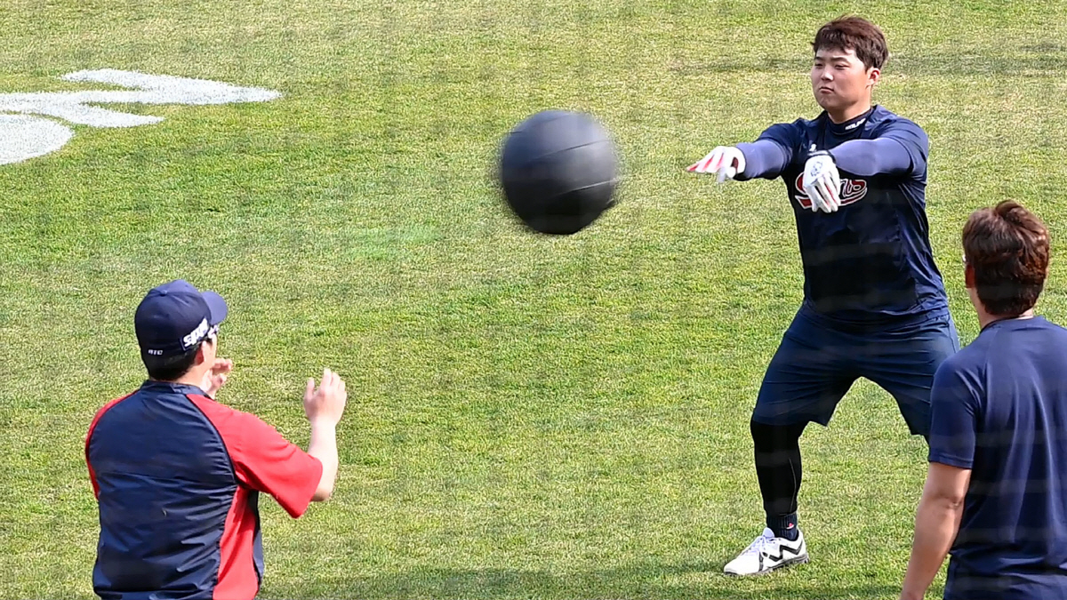 늘 하는 운동이지만 할때마다 힘이 드는 모습이다. 야구공 보다 크고 무거운 메디신 볼을 잡은 선수들은 동작을 반복하며 땀을 뻘뻘 흘렸다.