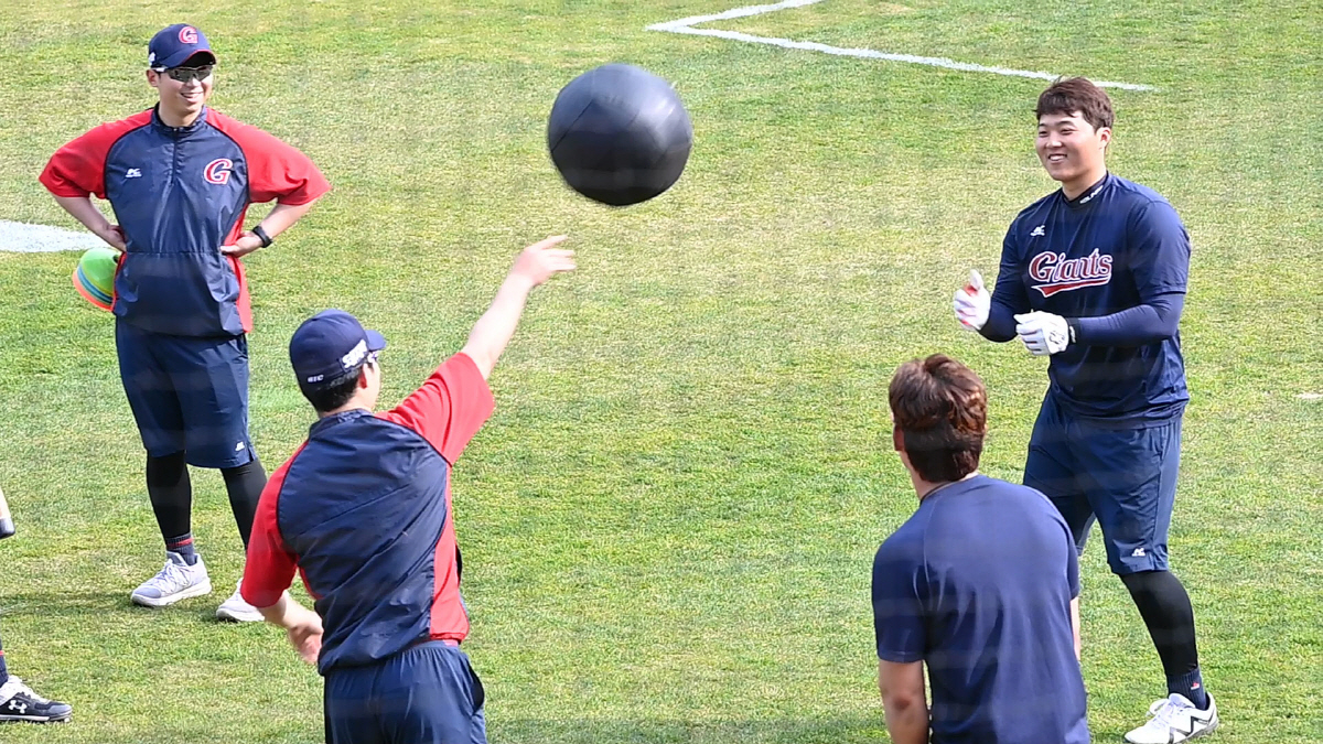 21일 부산 사직구장에서 열린 두산과의 홈경기에 앞서 그라운드에 나선 두 선수는 농구공 보다 큰 메디신볼을 들고 패스를 하는 동작과 바닥에 크게 튕기는 동작, 뒤로 돌아 공중으로 크게 던지는 동작 등을 반복했다.