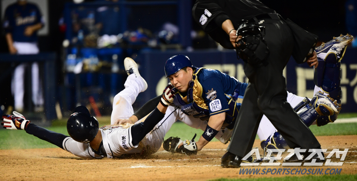 2-0으로 앞선 7회 말 2사 1사 2루 상황. 김재환이 2루수 땅볼을 친 사이 번뜩이는 플레이가 펼쳐졌다. 호세 페르난데스 대신 대주자로 2루에 있던 안권수가 3루를 밟더니 홈까지 쇄도했다. 공을 잡은 NC 1루수 이원재는 허겁지겁 홈으로 송구했다. 송구는 정확했고, 주자보다 타이밍도 빨랐다. NC 포수 양의지는 포구하자마자 주자에게 글러브를 내밀어 태그를 시도했다.