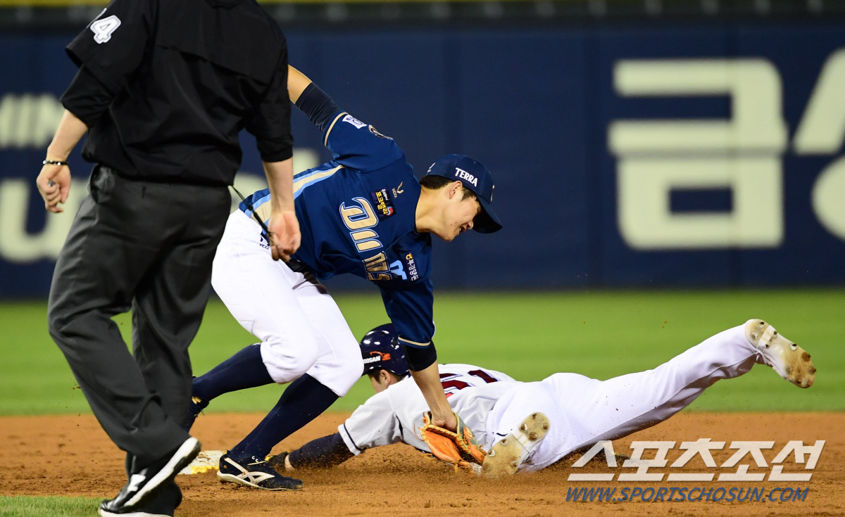 김재환이 2루수 땅볼을 친 사이 번뜩이는 플레이가 펼쳐졌다. 호세 페르난데스 대신 대주자로 2루에 있던 안권수가 3루를 밟더니 홈까지 쇄도했다. 공을 잡은 NC 1루수 이원재는 허겁지겁 홈으로 송구했다. 송구는 정확했고, 주자보다 타이밍도 빨랐다. NC 포수 양의지는 포구하자마자 주자에게 글러브를 내밀어 태그를 시도했다.